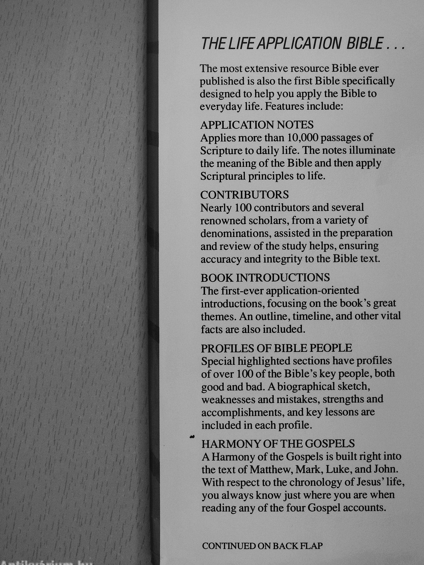 APPLICATION NOTES Applies more than 10,000 passages of Scripture to daily life. The notes illuminate the meaning of the Bible and then apply Scriptural principles to life.