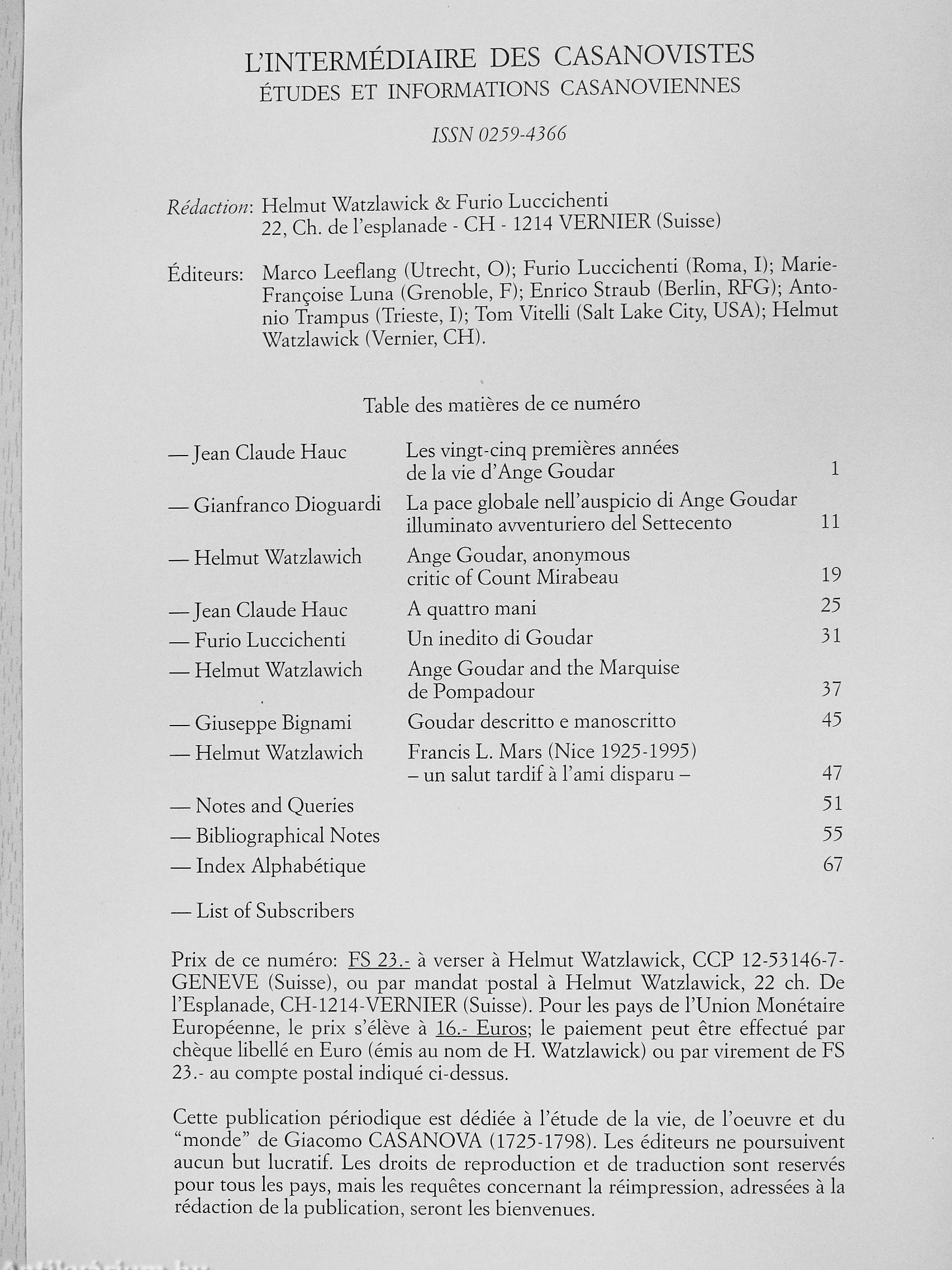 | Sorozatcím: | L'Intermédiaire des Casanovistes |