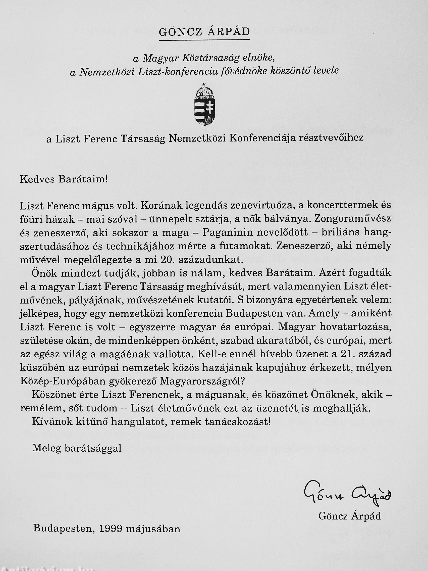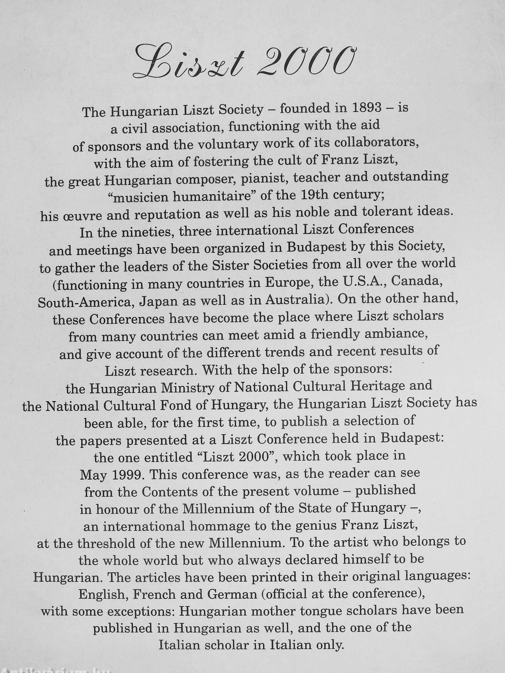 Liszt research. With the help of the sponsors: the Hungarian Ministry of National Cultural Heritage and the National Cultural Fond of Hungary, the Hungarian Liszt Society has been able, for the first time, to publish a selection of the papers presented at a Liszt Conference held in Budapest: the one entitled "Liszt 2000", which took place in May 1999. This conference was, as the reader can see from the Contents of the present volume - published in honour of the Millennium of the State of Hungary -, an international hommage to the genius Franz Liszt, at the threshold of the new Millennium. To the artist who belongs to
