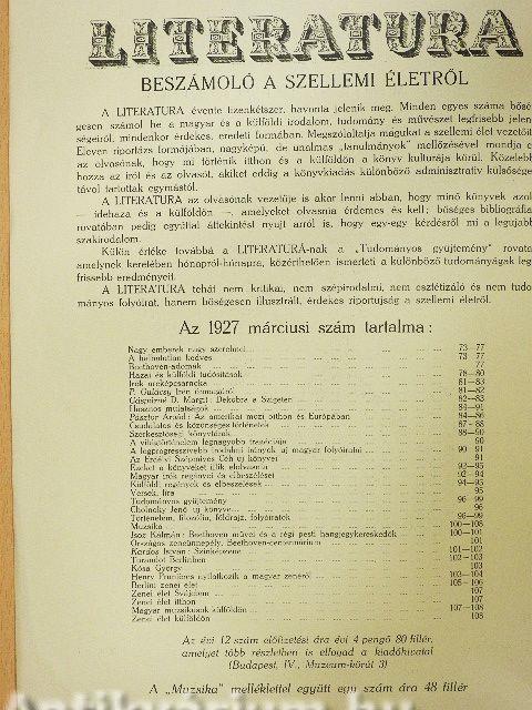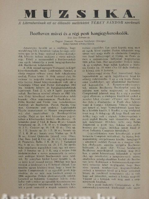 | Megjegyzés: | Fekete-fehér képekkel illusztrált. "Muzsika" a Literatura állandó mellékletével. Nyomtatta a Hungária Hirlapnyomda R.-T., Budapest. |
