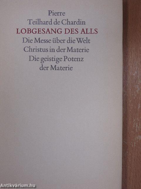 «Ich lebe inmitten eines einzigen Elements, Zentrum und Einzelheit von allém, personale Liebe und kosmische Kraft. Um es zu erreichen und mich mit ihm zu verschmelzen, habe ich das ganze Universum vor mir mit seinen edlen Kampfen, mit seinem leidenschaftlichen Forschen, mit seinen Myriaden zu vervollkommnender und zu heilender Seelen.» Von diesem Universum spricht der dreifache Lobgesang des Alis - ein Zeugnis der persönlichen ErgrifFenheit über das innerste Geheimnis der Weit, wie Teilhard es religiös und wissenschaftlich erlebte. Zwei dieser Bekenntnisse in hymnischer Sprache sind in Extremsituationen seines Lebens entstanden, in der Einsamkeit der chinesischen Ordos-Wüste, als er, mangels eines kirchlichen Altars, auf dem «Altar der ganzen Erde» seine hohe Messe über die Gestalten der nackten Wüste, über das Universum als «Sakrament der Weit»sprach, und in der Verlassenlieit mitten im Grauen des Ersten Weltkrieges, als er erkannte, wie «durch die geheimnisvolle Expansion der Hostie», die er als Soldatenpriester bei sich trug, «die Weit aufgeglüht war - in ihrer Totalitat vergleichbar einer einzigen