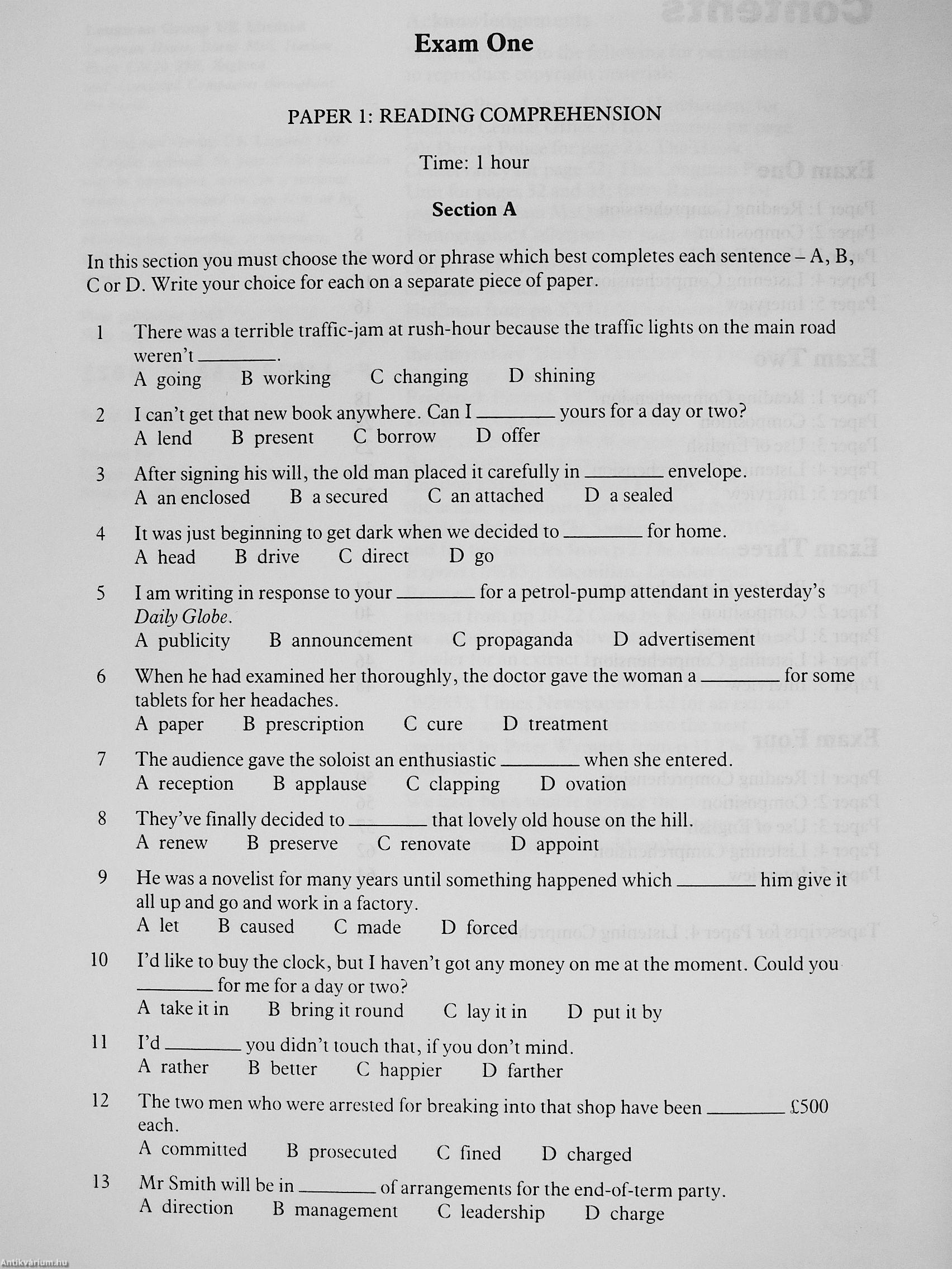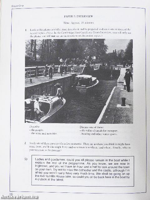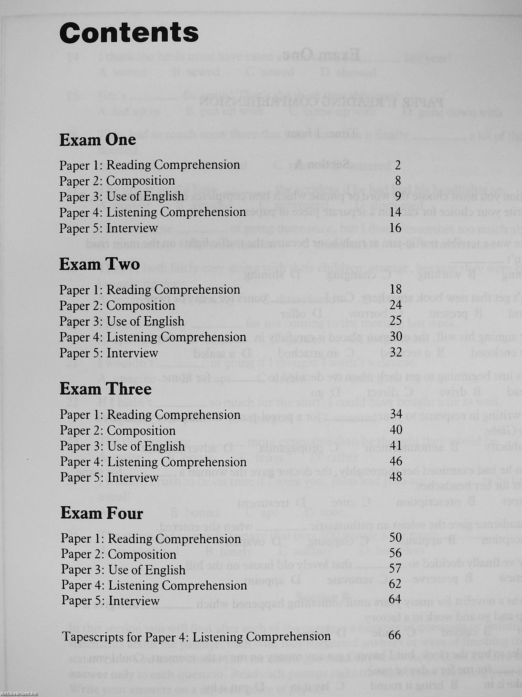 contains four complete exams, each comprising five Papers. Each exam is equivalent to a full Cambridge First Certificate examination in level, form and length.