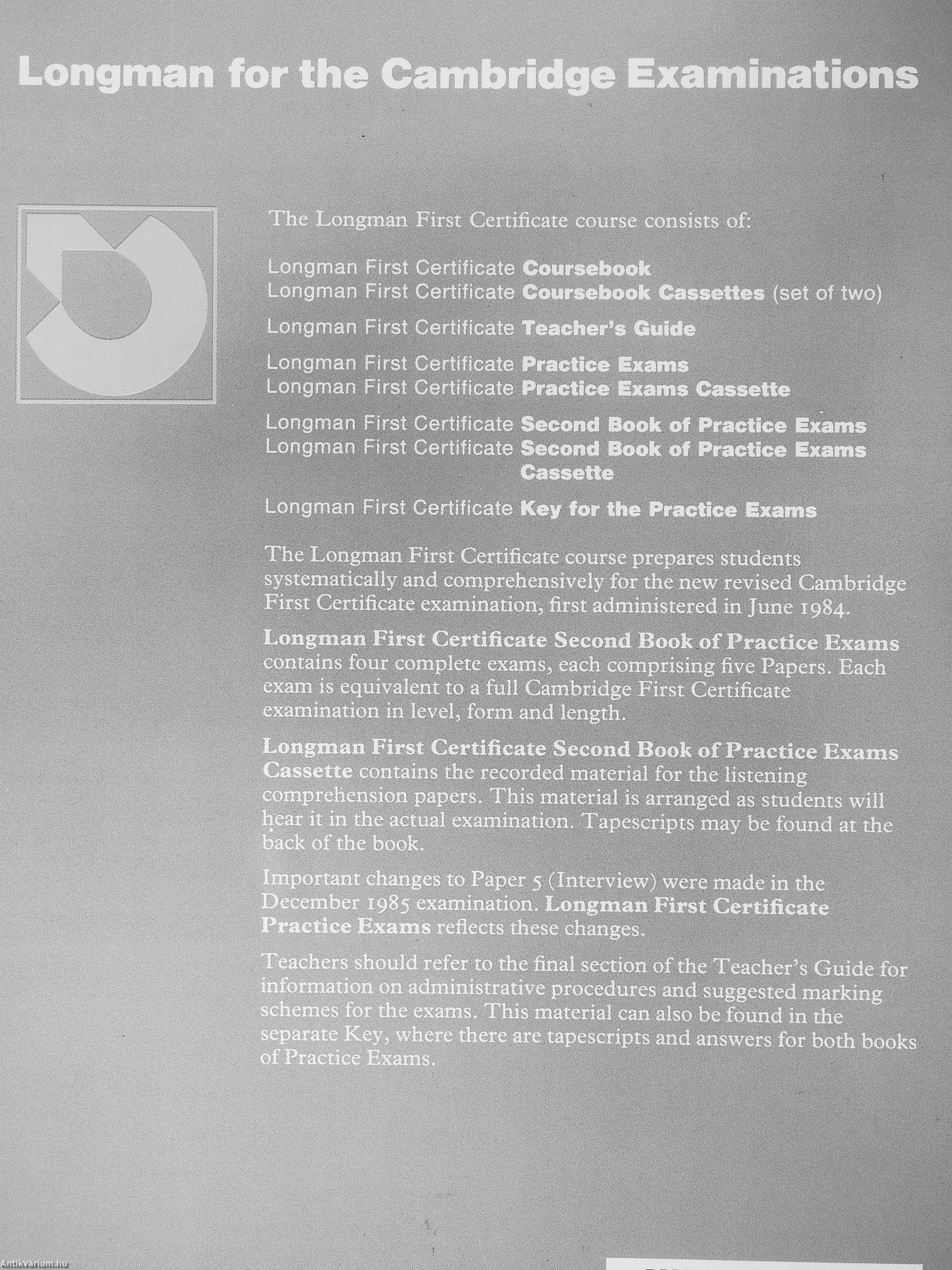 The Longman First Certificate course prepares students systematically and comprehensively for the new revised Cambridge First Certificate examination, first administered in June 1984.