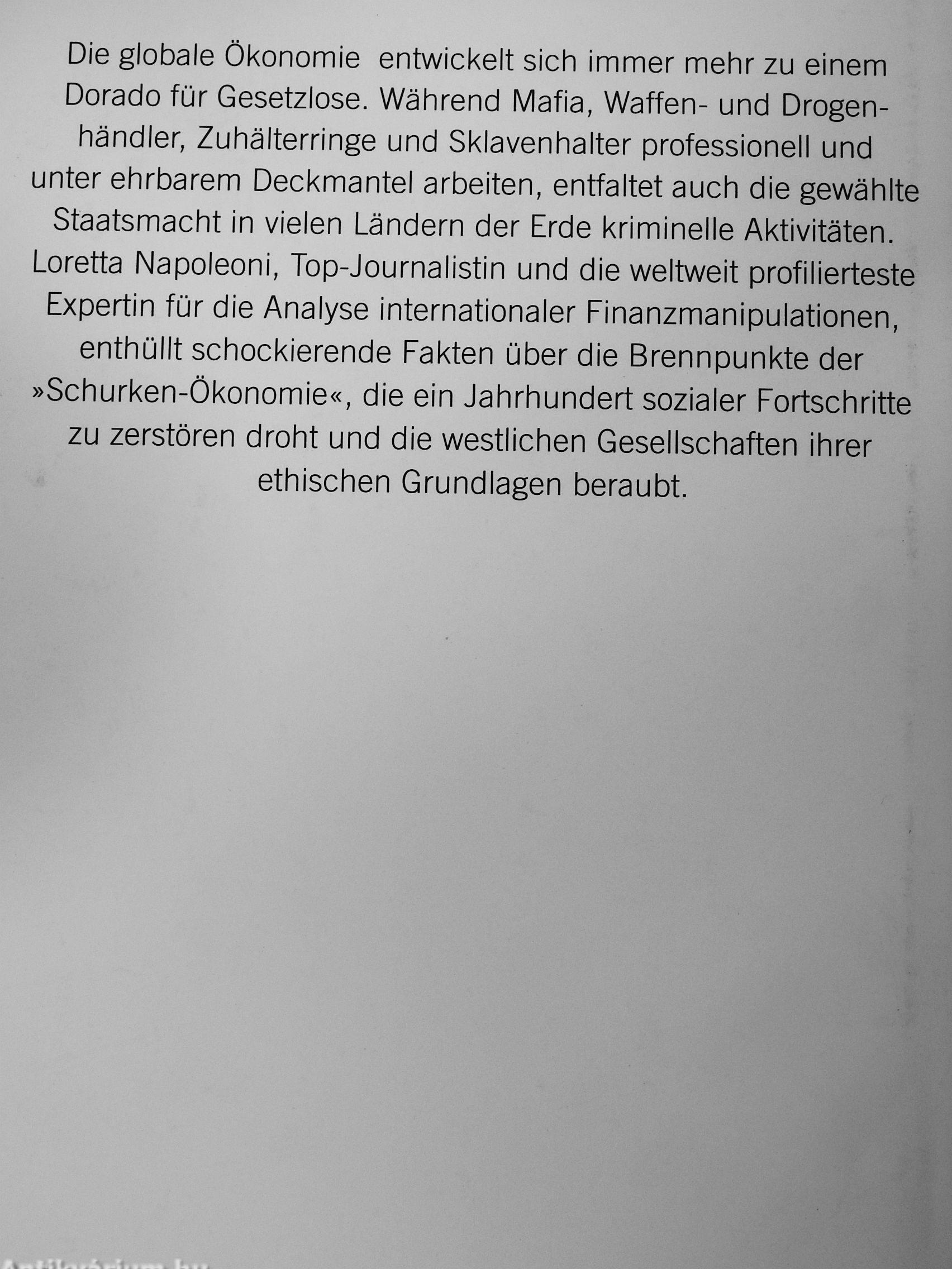 Loretta Napoleoni wagt sich furchtlos in den Sumpf globaler ökonomischer Verflechtungen. Sie enthüllt die Machenschaften der Russenmafia ebenso wie die Mentalität eingesessener italienischer Mafia-Familien, das dunkle Erfolgsgeheimnis des aufstrebenden China, den amerikanischen (Alb-)Traum der verelendeten US-Mittelklasse und die selten gewürdigte Eigenart des islamischen Finanzsystems. Sie stellt Krieg, Terror, Verelendung und überhandnehmende mafiose Verbrechensstrukturen als Folgeerscheinung eines Amok laufenden globalen Marktes bloß. Es gibt nur eines, was die gesetzlosen Profiteure der Globalisierung fürchten: den Konsumenten und seine Macht, bestimmte Produkte zu kaufen oder zu verschmähen. So ist dieses Buch auch ein Appell an jeden von uns, die Gesetze des Handelns wieder in die eigenen Hände zu nehmen.