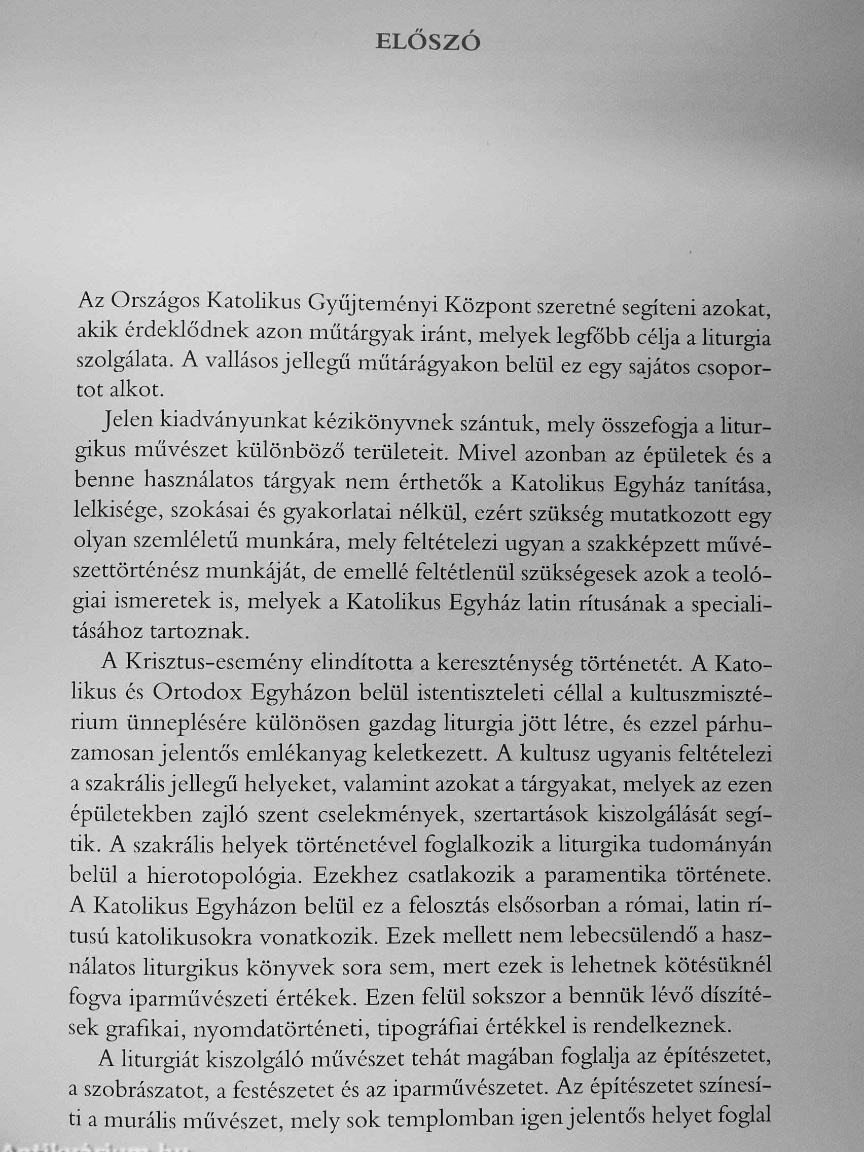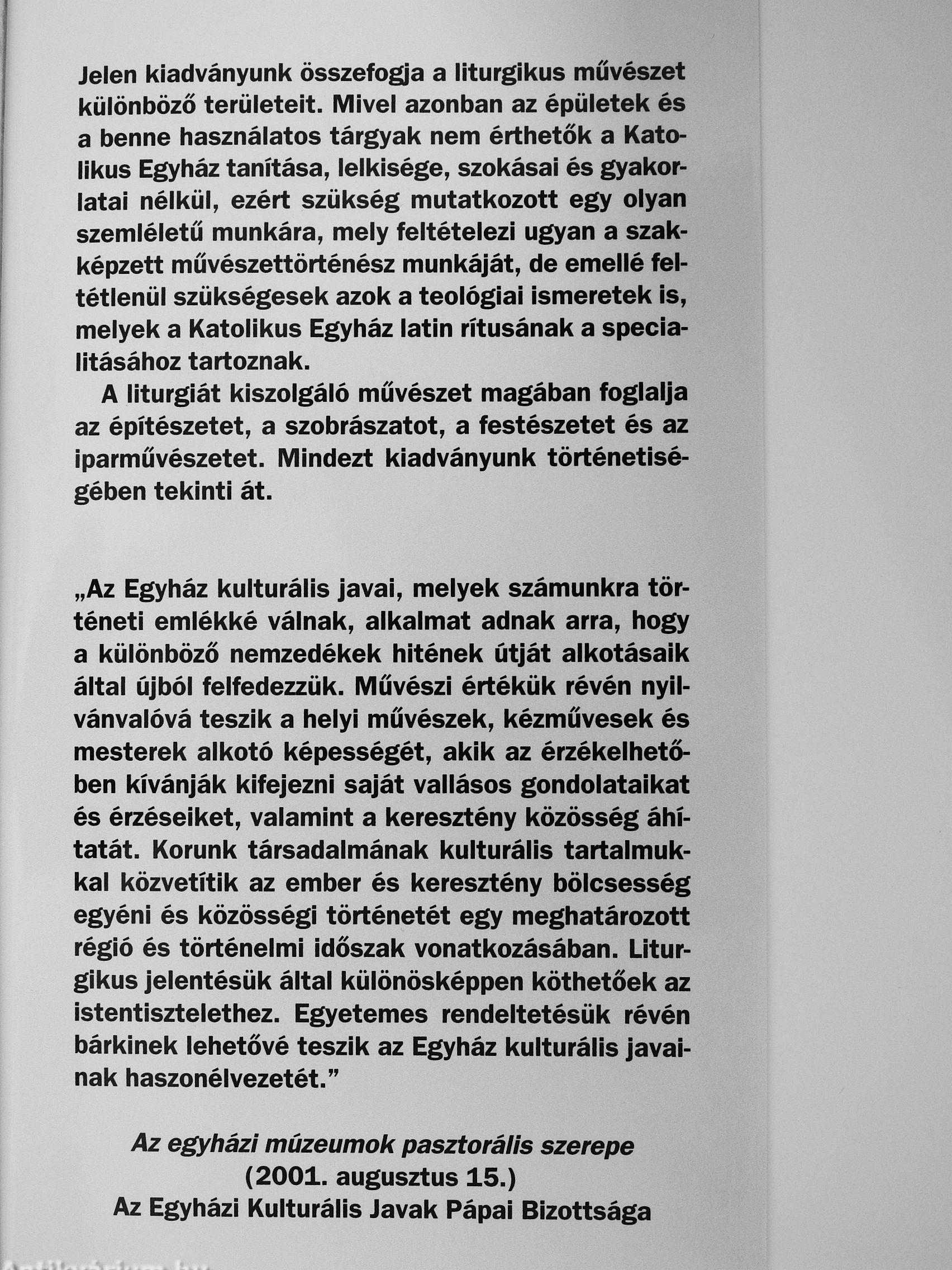 A liturgiát kiszolgáló művészet magában foglalja az építészetet, a szobrászatot, a festészetet és az iparművészetet. Mindezt kiadványunk történetiségében tekinti át.