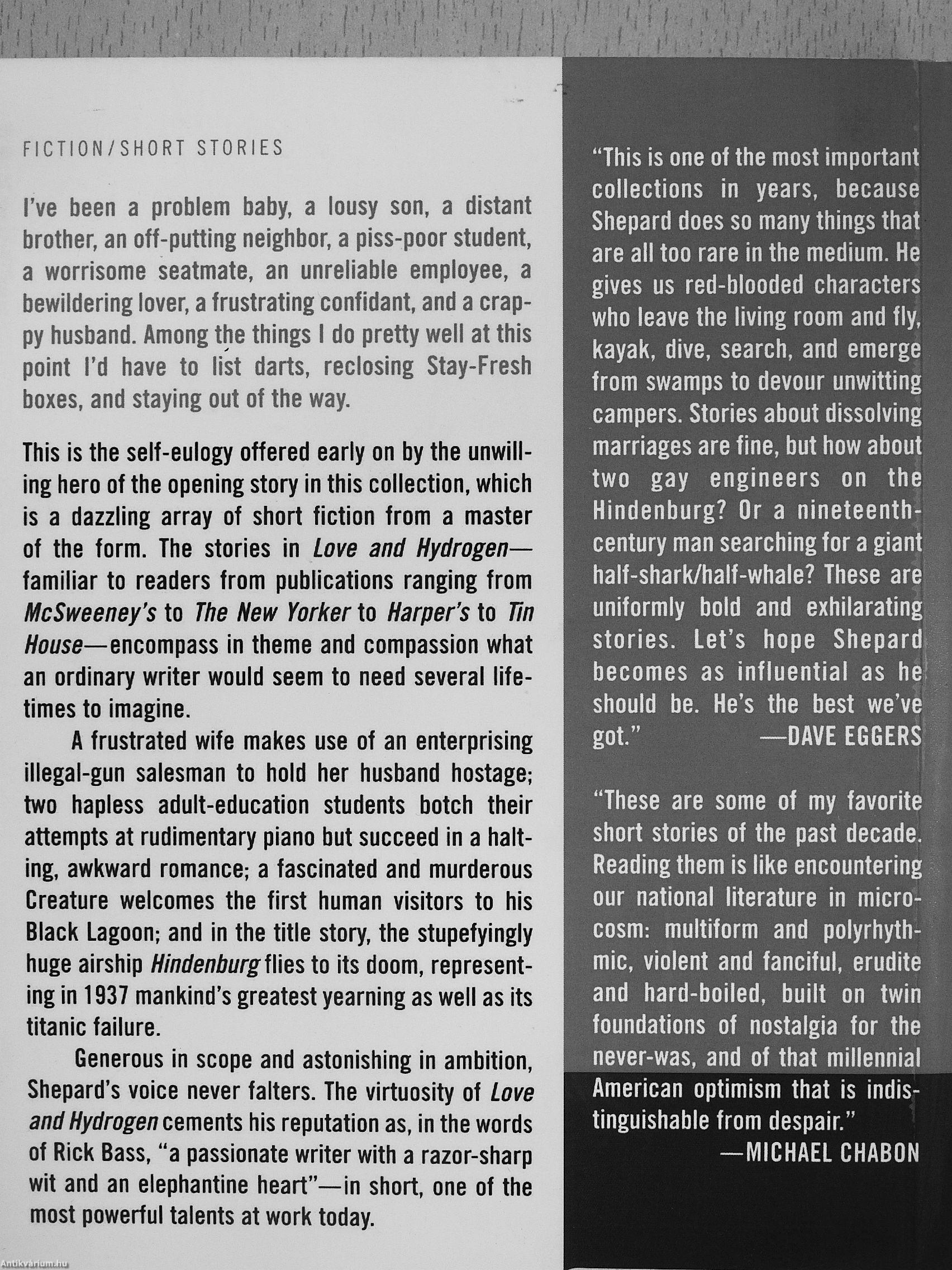 Generous in scope and astonishing in ambition, Shepard's voice never falters. The virtuosity of Love and Hydrogen CBmenh his reputation as, in the words of Rick Bass, "a passionate writer with a razor-sharp wit and an elephantine heart"—in short, one of the most powerful talents at work today.