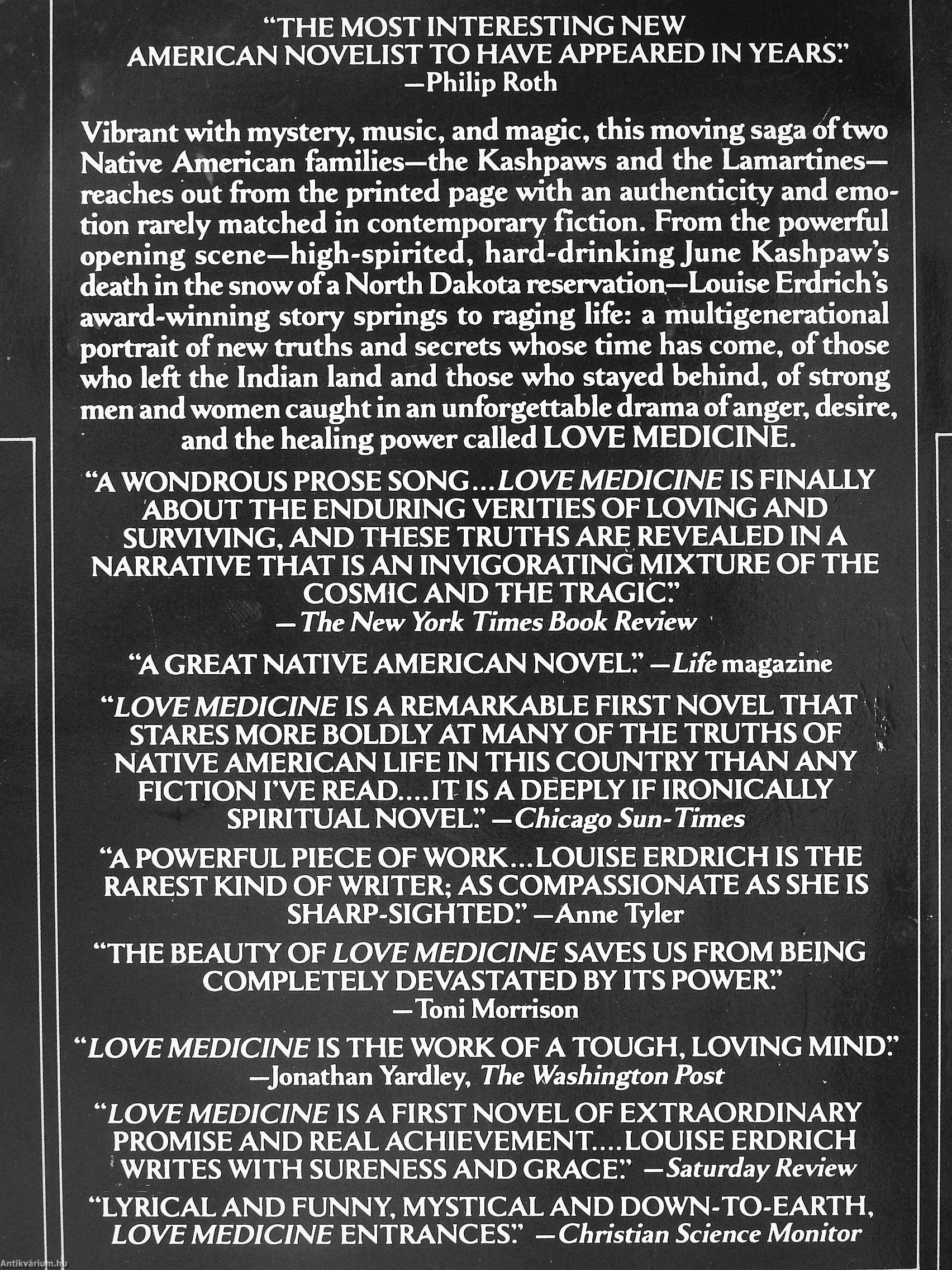 Vibrant with mystery, music, and magic, this moving saga of two Native American families—the Kashpaws and the Lamartines— reaches out fram the printed page with an authenticity and emotion rarely matched in contemporary fiction. From the powerful opening scene—high-spirited, hard-drinking June Kashpaw s death in the snow of a North Dakota reservation—Louise Erdrich s award-winning story springs to raging life: a multigenerational portrait of new truths and secrets whose time has come, of those who left the Indian land and those who stayed behind, of strong men and women caught in an unforgettable drama of anger, desire, and the healing power called LOVE MEDICINE.