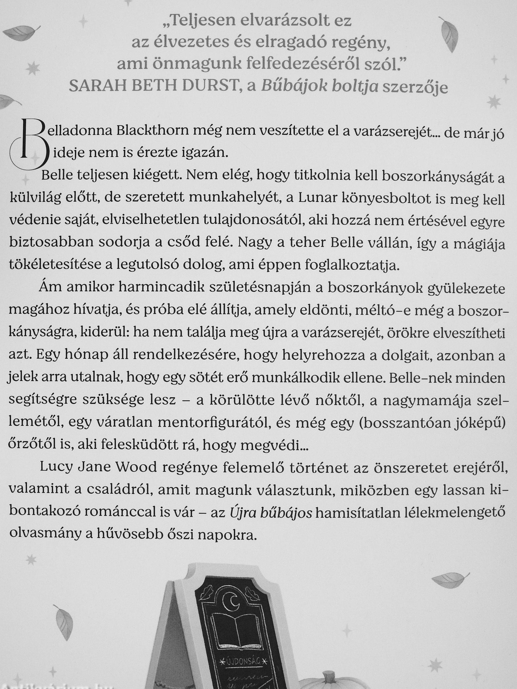 Lucy Jane Wood regénye felemelő történet az önszeretet erejéről, valamint a családról, amit magunk választunk, miközben egy lassan kibontakozó románccal is vár - az Újra bűbájos hamisítatlan lélekmelengető olvasmány a hűvösebb őszi napokra.