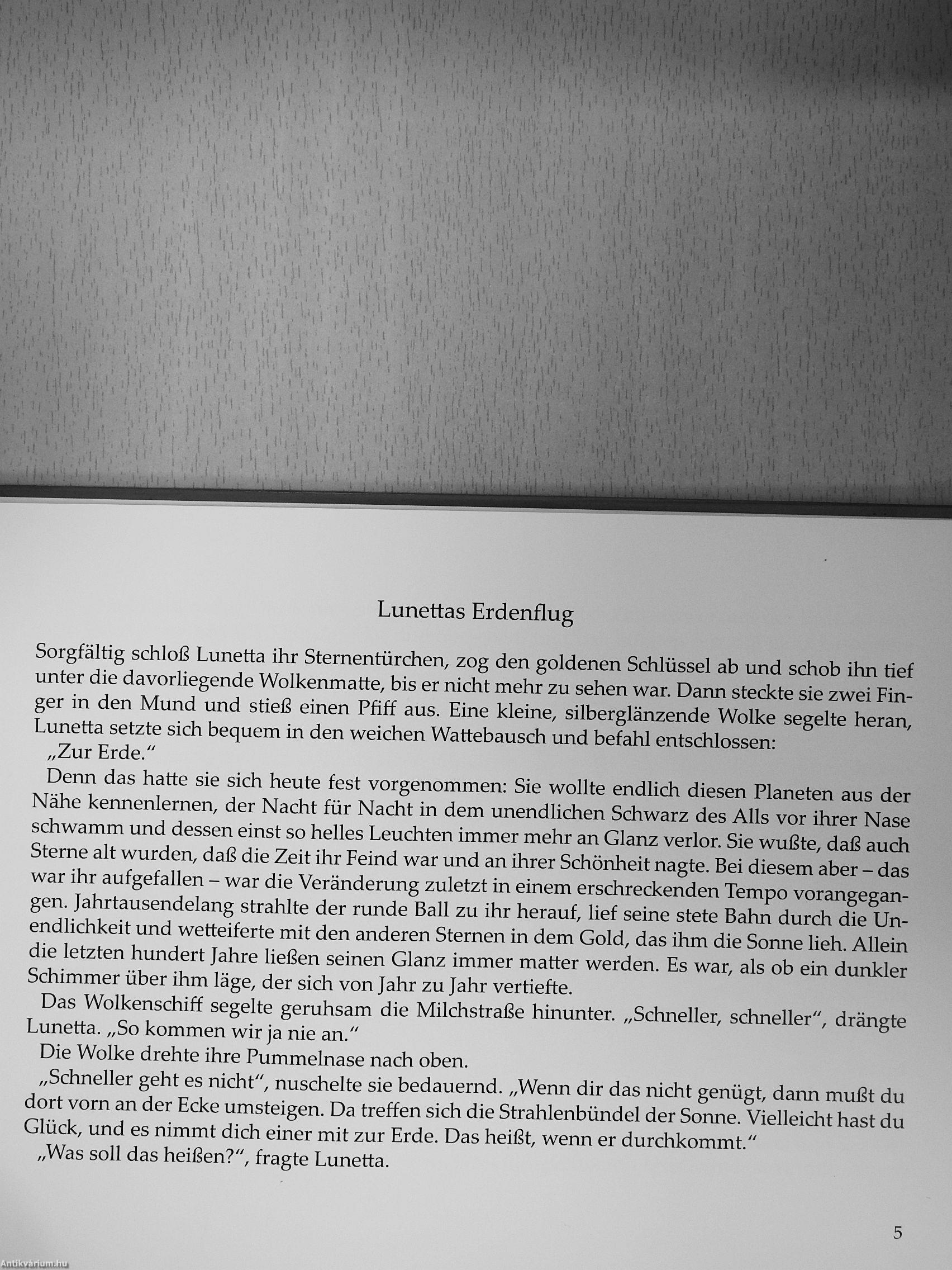 ' „LUNETTA" ist eine phantasievolle Geschichte, nicht nur für Erwachsene, mit schönen Illustrationen von ' Sabrina Wanie, über die Liebe einer Familie, die Schönheit der Erde und die Notwendigkeit deren Erhaltung, eine Geschichte, die zeigt, daß ein Jeder aus dem Kleinen heraus wirken kann.