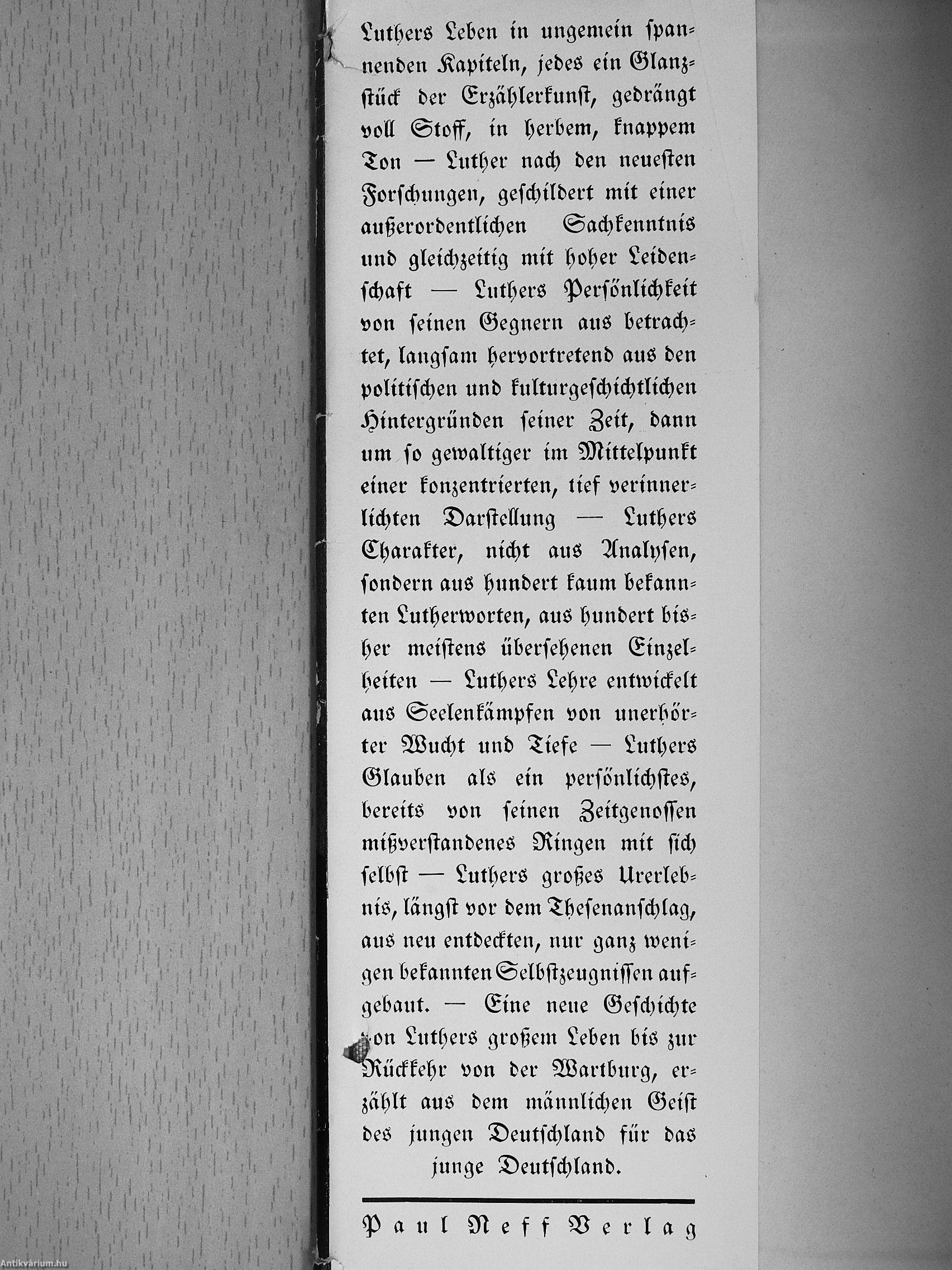 iiitßei-ö Sebcn tn ungemein fpan» nenben .^a^jtteln, jebeS ein ©lanj» flücf bei- (Erjal^lerfunfi, gebrangt »off (Stoff, in t)ei-t»em, fnappem "ion — Luif)ei- nad) ben neueflen goi-fdningen, gefd)tibeft mit einer oniicrorbentltitien @a(i)fenntntö unb gletdijetttg mit f)o^cr Setben» fc^aft — Lnt(ierö ^erfönlti^fett »on feinen ©egnern ans betrad)» tet, langfam ^ieryortretenb aiiö ben ^oltttfd)en unb fnltnrgefd)td)tlt4»en .^tntergrünben feiner i"»«" um fo getvalttger tm SJlitteipunft einer ionjentrierten, lief »ertnner» ltd)ten 3)arjieliung — Sut^ers d^arafter, ntdjt atiS 2inali;fen, fonbern aus "^nnbert fanm befann» ten Sut^ectworten, anö ininbert btö= i)a meiftenö iiberfei)enen (Stnjel» (leiten — Sut^erö Seigre enttvtcfeit aus ©eelenfämpfen »on nnerhör» ter 5ö3ud)t «nb 5tefe — SntlKrö ©lanben als ein perfonltdifieS, bereits »on feinen gettgenoffen mt§V)eritanbeneS SRtngen mit ftd) feibfi — iutbers grof?eS Urerleb» ntS, langli »or bem 'if)efenanfd)iag, ans neu entbecften, nur ganj... Tovább