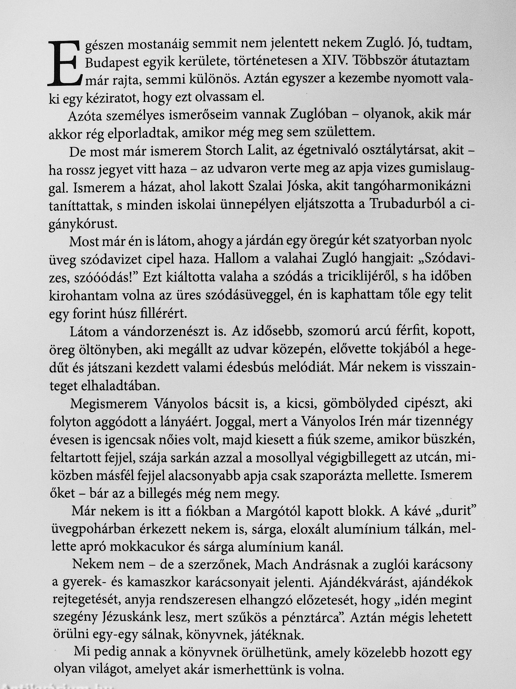 Nekem nem - de a szerzőnek, Mach Andrásnak a zuglói karácsony a gyerek- és kamaszkor karácsonyait jelenti. Ajándékvárást, ajándékok rejtegetését, anyja rendszeresen elhangzó előzetesét, hogy „idén megint szegény Jézuskánk lesz, mert szűkös a pénztárca". Aztán mégis lehetett örülni egy-egy sálnak, könyvnek, játéknak.