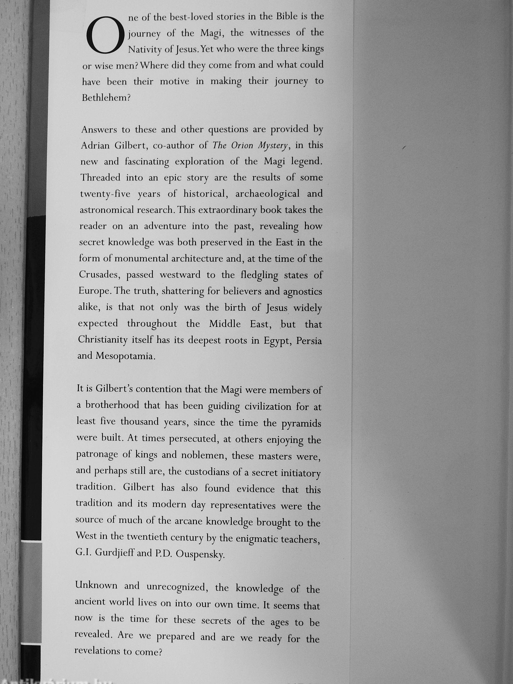 It is Gilbert's contention that the Magi were members of a brotherhood that has been guiding civilization for at least five thousand years, since the time the pyramids were built. At times persecuted, at others enjoying the patronage of kings and noblemen, these masters were, and perhaps still are, the custodians of a secret initiatory tradition. Gilbert has also found evidence that this tradition and its modern day representatives were the source of much of the arcane knowledge brought to the West in the twentieth century by the enigmatic teachers, G.I. Gurdjieff and PD. Ouspensky.