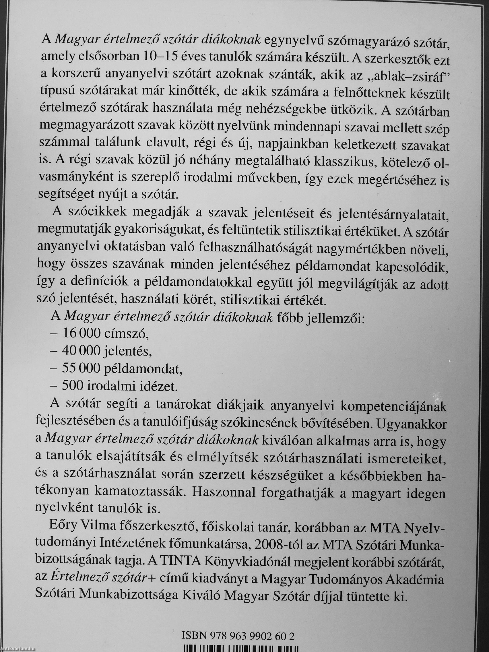 A Magyar értelmező szótár diákoknak egynyelvű szómagyarázó szótár, amely elsősorban 10-15 éves tanulók számára készült. A szerkesztők ezt a korszerű anyanyelvi szótárt azoknak szánták, akik az „ablak-zsiráf típusú szótárakat már kinőtték, de akik számára a felnőtteknek készült értelmező szótárak használata még nehézségekbe ütközik. A szótárban megmagyarázott szavak között nyelvünk mindennapi szavai mellett szép számmal találunk elavult, régi és új, napjainkban keletkezett szavakat is. A régi szavak közül jó néhány megtalálható klasszikus, kötelező olvasmányként is szereplő irodalmi művekben, így ezek megértéséhez is segítséget nyújt a szótár.