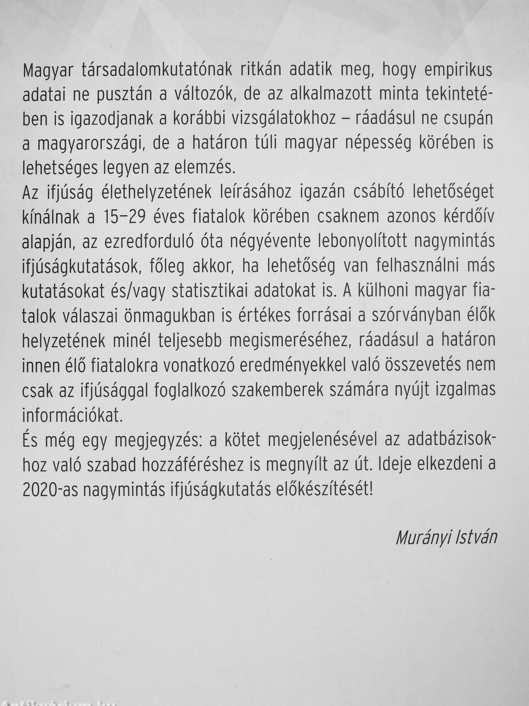 Magyar társadalomkutatónak ritkán adatik meg, hogy empirikus adatai ne pusztán a változók, de az alkalmazott minta tekintetében is igazodjanak a korábbi vizsgálatokhoz - ráadásul ne csupán a magyarországi, de a határon túli magyar népesség körében is lehetséges legyen az elemzés.