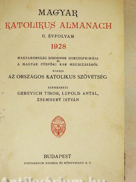 Azzal a tudattal adjuk közre a Magyar Katolikus Almanach II. évfolyamát, hogy az Anyaszentegyházat mindig hűen szolgálni kész szándékunkkal sikerült oly kiadványt létesíteni, melyet hasznosan forgathat minden magyar katolikus s amely méltóan illeszti a magyar katolicizmus képét a világegyház pompás nagy keretébe. Vindikáljuk a magyar katolicizmus részére annak az öntudatnak jogát, hogy egyházkormányzati szétdaraboltságának, testvérei erőszakos elszakításának fájdalmas idejében is, megfeszített erővel és a jobb jövőbe vetett szilárd hittel megteszi kötelességét és semmiben sem marad hátra más, szerencsésebb országok katolikusai mögött, mint ahogy e hazában is példát mutat a hazafiúi erényekben és áldozatkészségben a más vallású honfitársaknak.