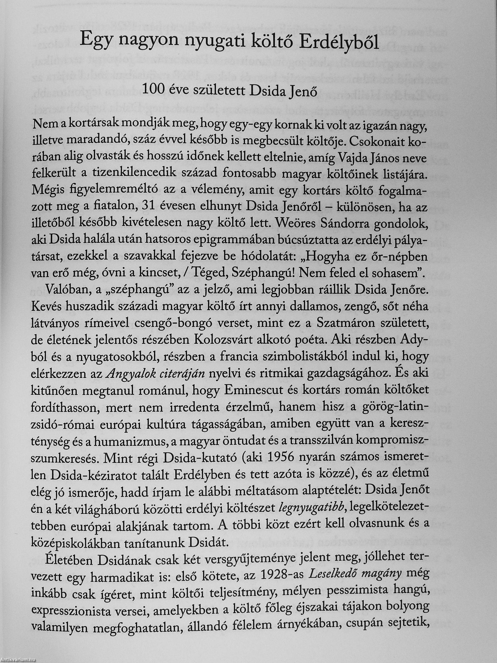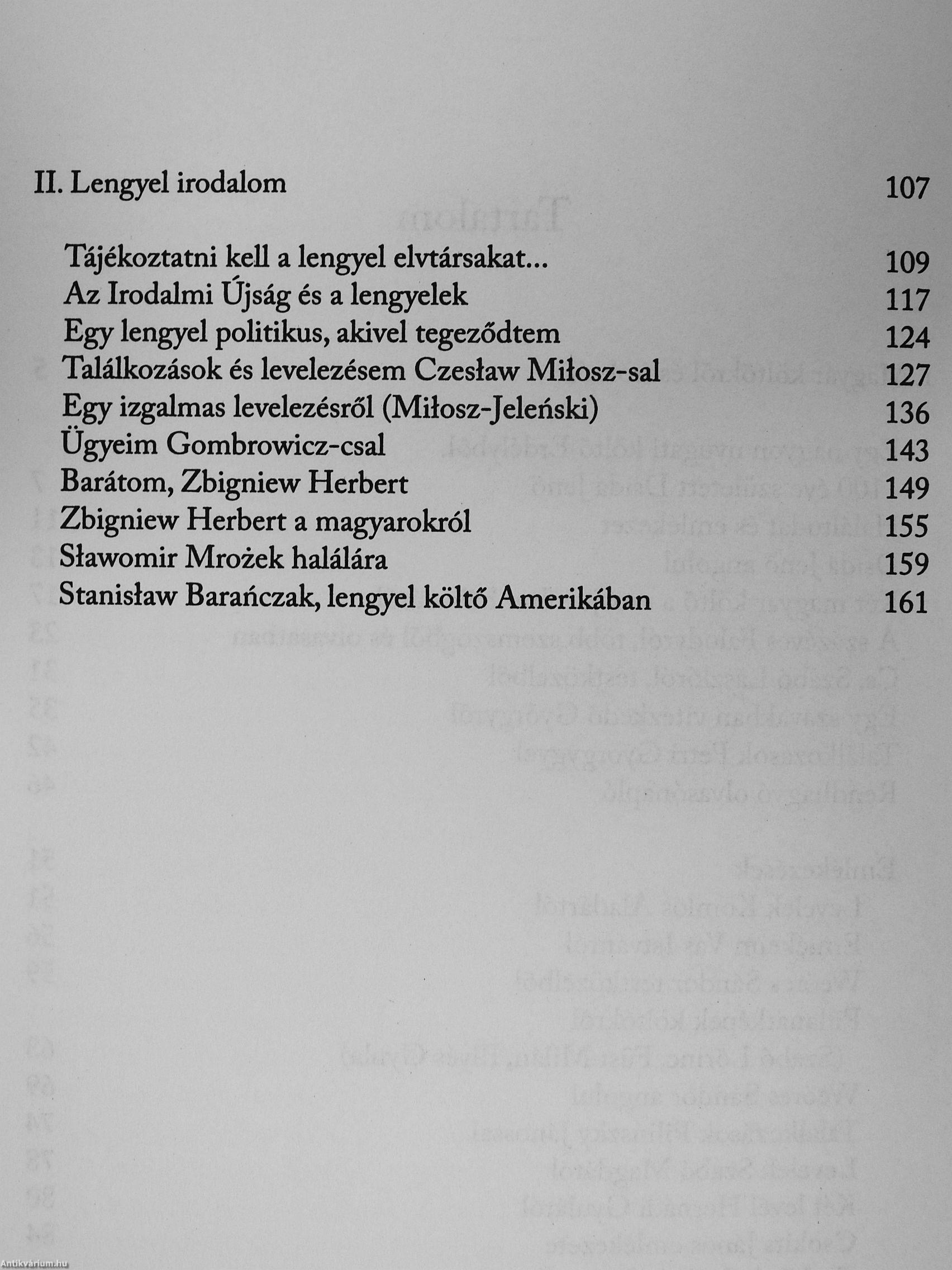 Könyvének első része magyar irodalmi tanulmányokat, a második írókról-művészekről írt személyes emlékeket tartalmaz, a harmadik válogatás lengyel tárgyú, többnyire irodalmi esszéiből. Magyarországi és „nyugati" magyar írókkal egyaránt foglalkozik (például Cs. Szabó László, Faludy György), megidézi emléküket (Vitéz György, Csokits János). Az írásokban fontos szerepe van az emigráns lengyeleknek (például Milosznak, Gombrowicznak), illetve azoknak, akik a kommunista rendszer ellenzékét alkották (például... Tovább