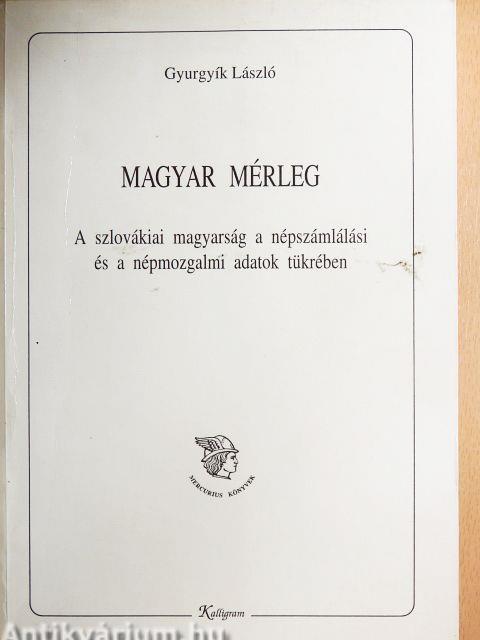 A Magyar mérleg a szlovákiai magyar nemzetiségű lakoság demográfiai változásait vizsgálja az 1991. évi népszámlálási és népesedésstatisztikai adatok alapján. Bár a könyv elsősorban az 1980-as évek során végbement változásokat elemzi, egyes kiemelt mutatókat hosszabb időszakra visszamenőleg is ismertet.