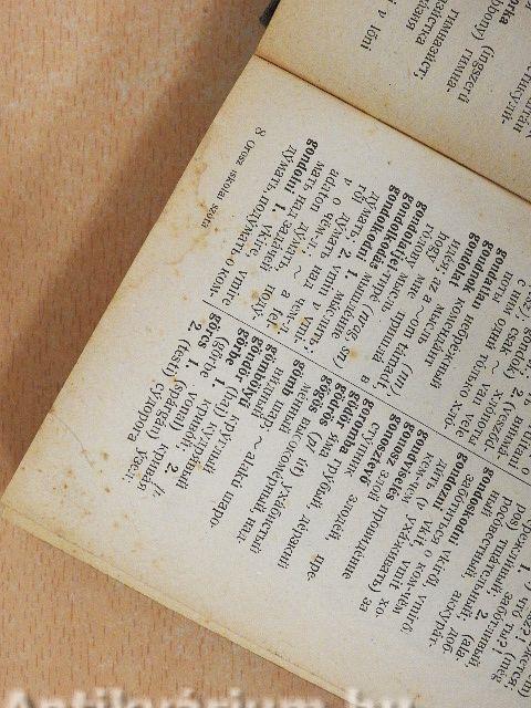 Ebben a részben az orosz szavak mellett már nem találsz részletes nyelvtani adatokat és példamondatokat sem mindenütt. Pedig ezek éppen a magyarról oroszra való fordításhoz kellenek leginkább. A szótárnak ez a része ugyanis az orosz-magyar részre épült. Azért is van vele egybekötve, hogy a két részt együtt lehessen használni. Ha tehát szükséged van egy itt megtalált orosz szó nyelvtani adataira vagy a vele kapcsolatos kifejezésekre, a szót vissza kell keresned az orosz-magyar részben, ahol - az esetek többségében - meg is fogod találni.
