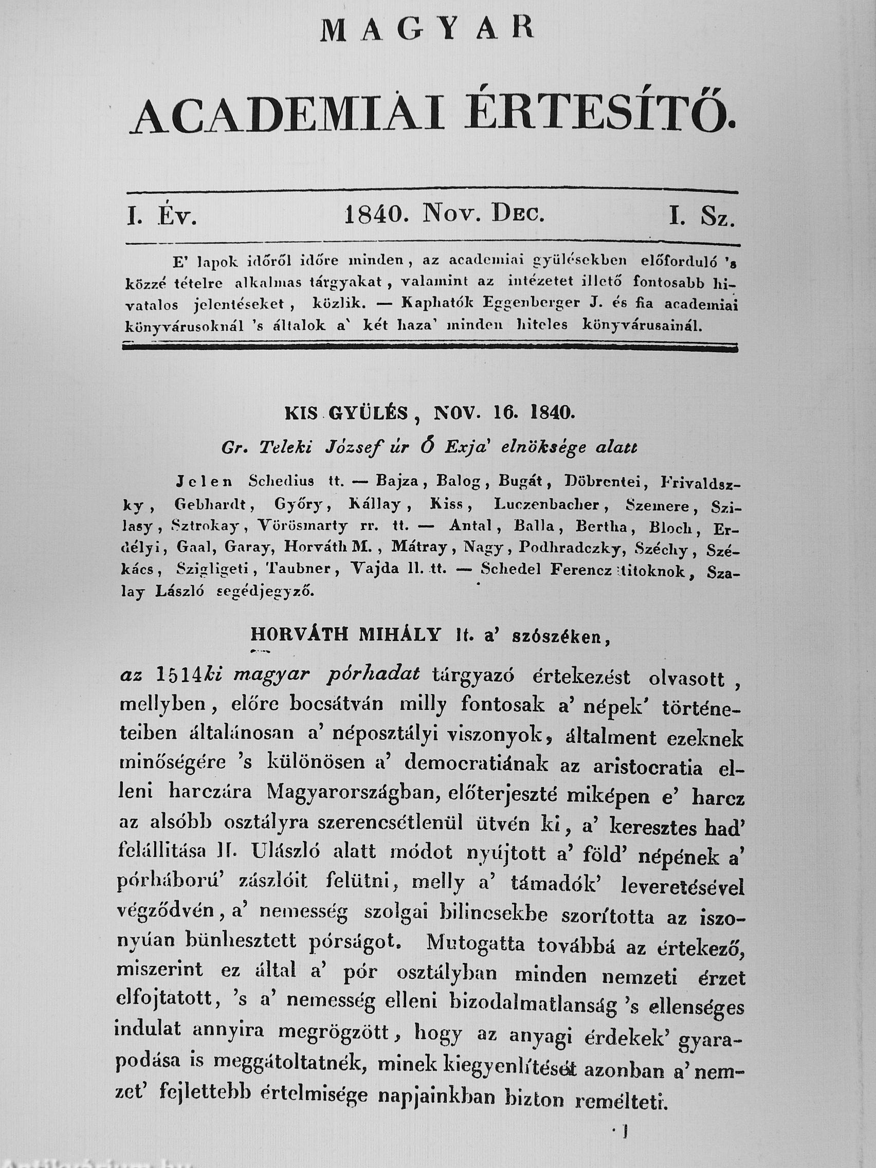 az Ibl^ii magyar pórhadat tárgjazó értekezést olvasott , mellyben, előre bocsátván miUy fontosak a' népek' történeteiben általánosan a' néposztály! viszonyok, általment ezeknek minőségére 's különösen a' democratiának az aristocratia elleni harczára Magyarországban, előterjeszté mlképen e' barez az alsóbb osztályra szerencsétlenül ütvén ki, a' keresztes had' íelállitása 11. Ulászló alatt módot nyiíjtott a' föld' népének a' pórháború' zászlóit felütni, melly a' támadók' leveretésével végződvén, a' nemesség szolgai bilincsekbe szorította az iszonyúan bünhesztett pórságot. Mutogatta továbbá az értekező, miszerint ez által a' pór osztályl)an minden nemzeti érzet elfojtatott, 's a' nemesség elleni bizodalmatlanság's ellenséges indulat annyira megrögzött, hogy az anyagi érdekek' gyarapodása is meggátoltatnék, minek kiegyenb'tésöt azonban a'nemzet' fejlettebb értelmisége napjainkban bizton reméltet!.