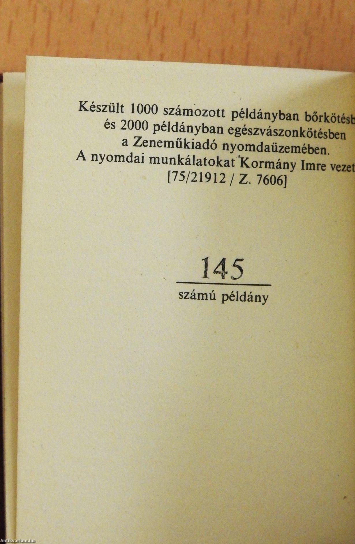 | Megjegyzés: | Számozott kiadás. Számozás színe: Fekete. Kiadott példányszám: 1000 számozott bőrkötésben és 2000 példányban egészvászonkötésben. Nyomda: Zeneműkiadó Nyomdaüzeme Kiadási alkalom: Megjelent a Rózsavölgyi és Társa alapításának 125. és a Zeneműkiadó Vállalat fennállásának 25. évfordulójára. Kottákkal. A könyv pontos mérete: 48 x 65 mm. Az impresszumban feltüntetett adatok ellenére a könyv nyl kötésű. |