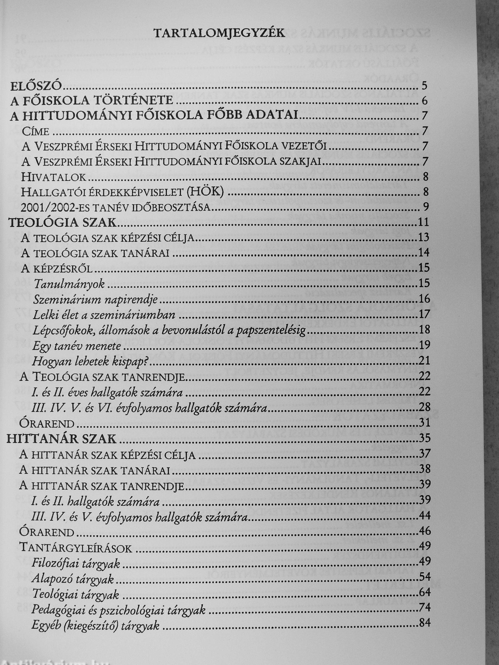 Veszprémi Hittudományi Főiskola tanulmányi tájékoztató 2001-2002