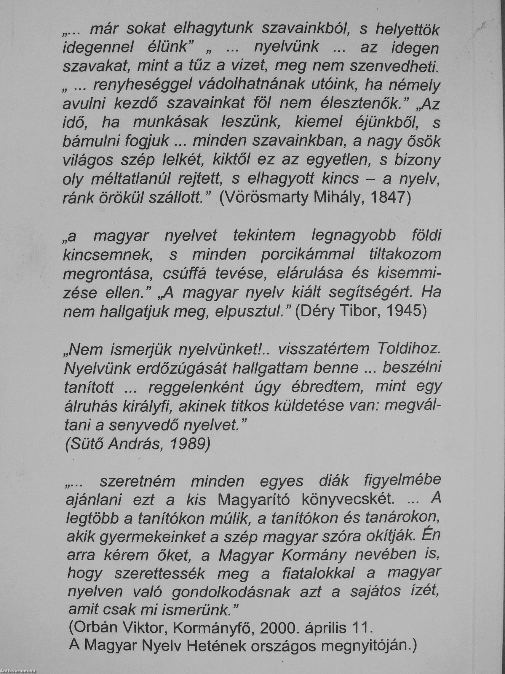 „ szeretném minden egyes diák figyelmébe ajánlani ezt a kis Magyarító könyvecskét. A legtöbb a tanítókon múlik, a tanítókon és tanárokon, akik gyermekeinket a szép magyar szóra okítják. Én arra kérem őket, a Magyar Kormány nevében is, hogy szerettessék meg a fiatalokkal a magyar nyelven való gondolkodásnak azt a sajátos ízét, amit csak mi ismerünk." (Orbán Viktor, Kormányfő, 2000. április 11. A Magyar Nyelv Hetének országos megnyitóján.)