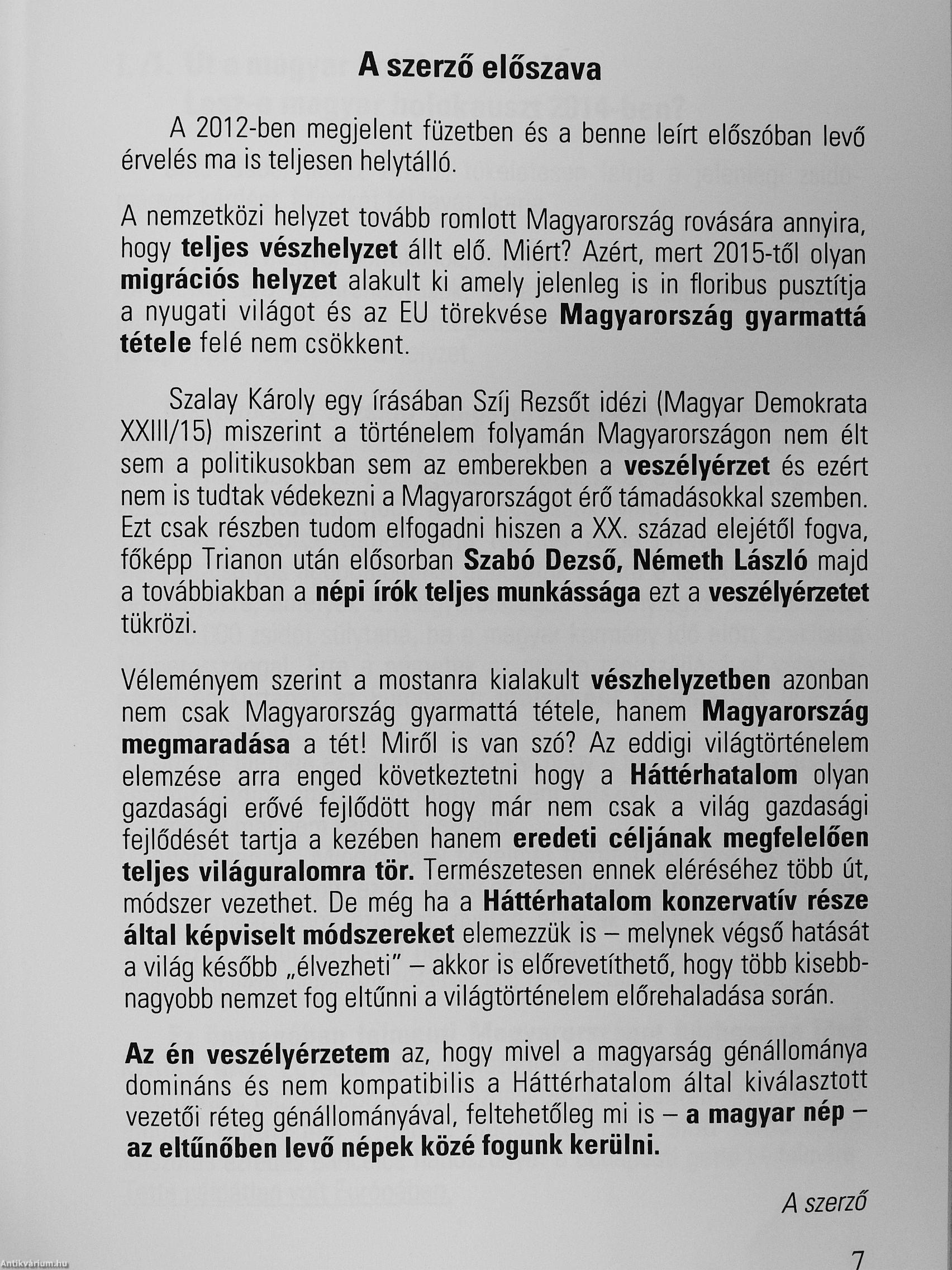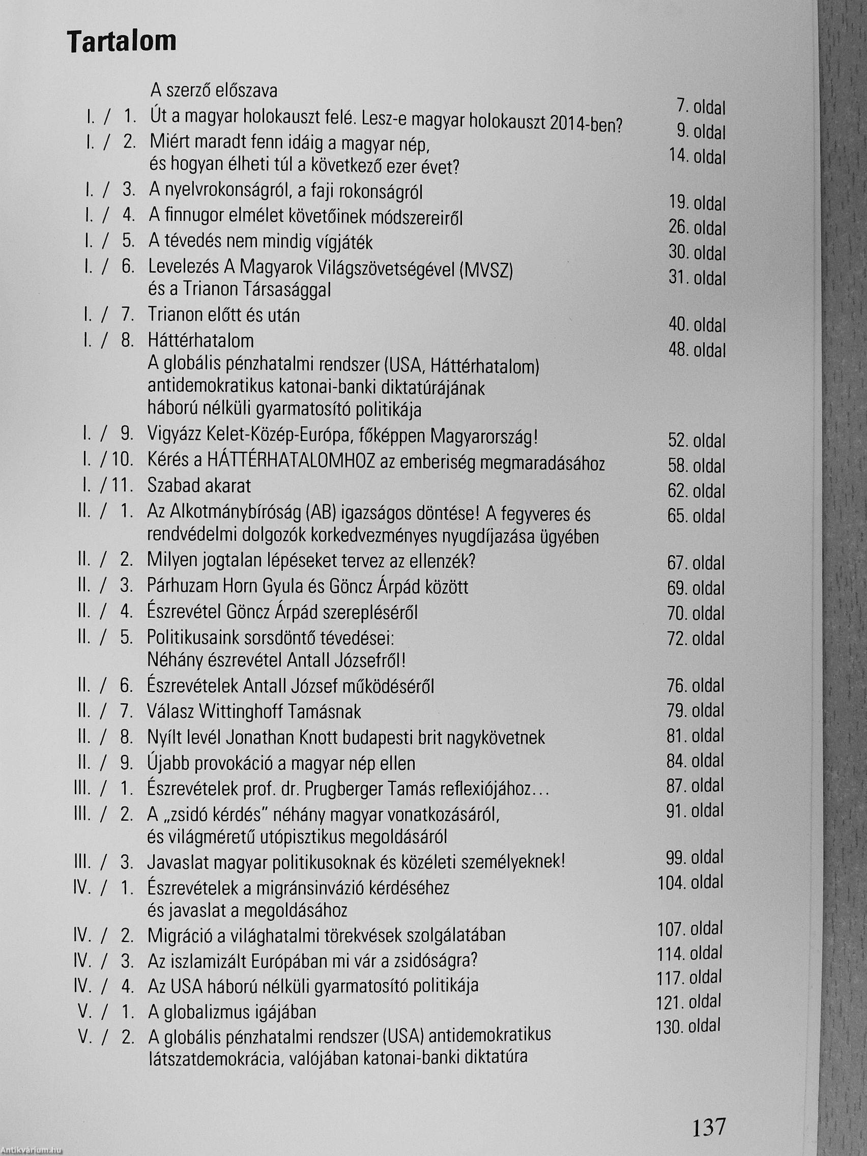 Igen fontos kérdés a zsidóság szerepe Magyarországon, továbbá Magyarország szerepe a „holokauszt"-ban. Az egyház és állam kapcsolatának lényeges vonatkozásaira is kitér. Felhívja a figyelmet arra, hogy a múlt század óta Európa és az egész nyugati világ mennyire háttérbe szorította és szorítja most is Magyarországot és milyen méltánytalanul kezeli.