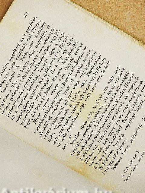| Megjegyzés: | Aranyozott gerincű félbőr kötésben. Néhány fekete-fehér képpel illusztrálva. "A dicsőség és szolgaság, az egynapos birodalmak az örök gondolatok földjének, az időt istenitő népnek, a feltámadt Indiának. Messiása elitélésének évfordulójára. 1922. március 18." Nyomtatta a Hornyánszky Viktor R. -T., Budapest. |