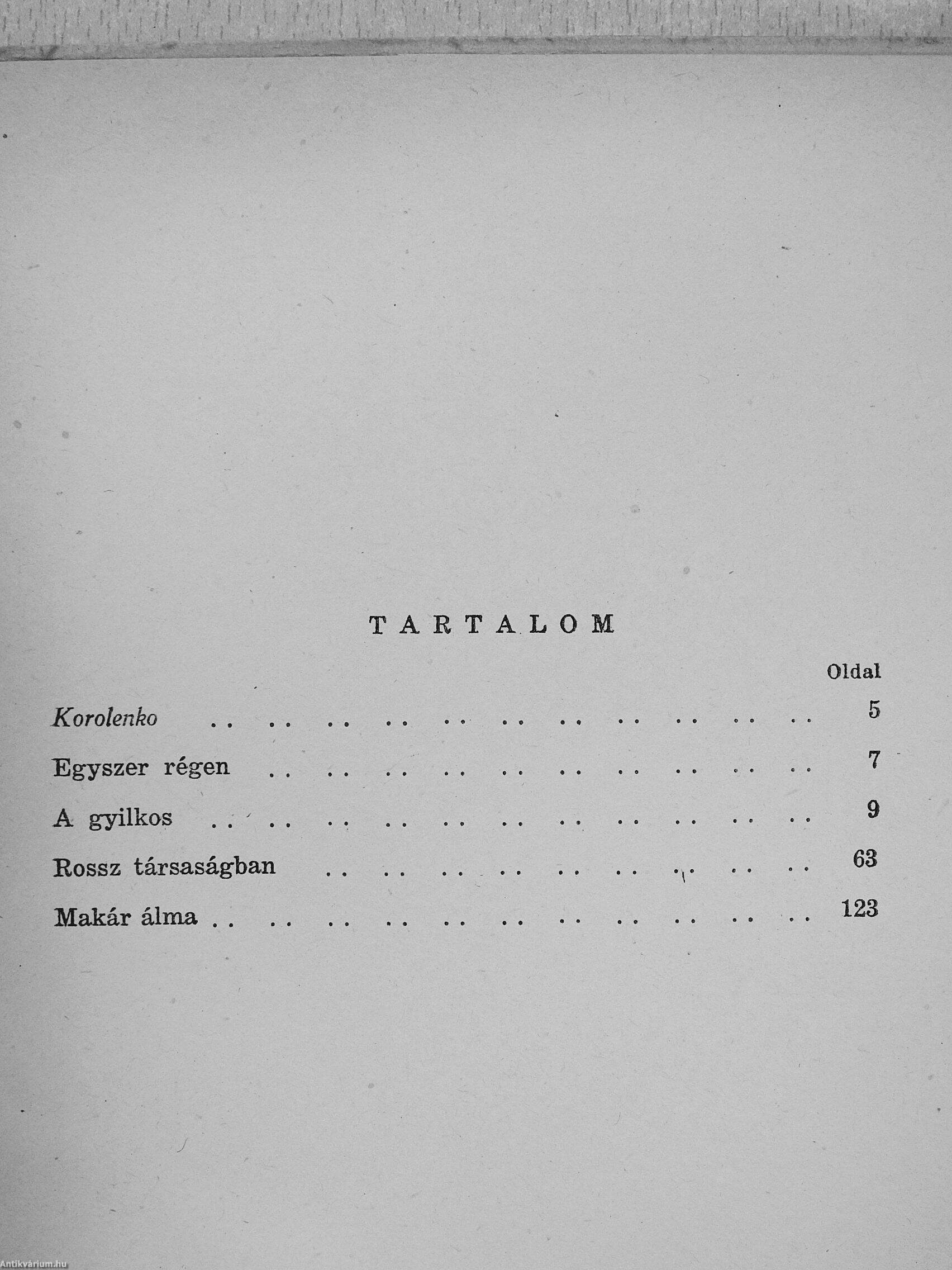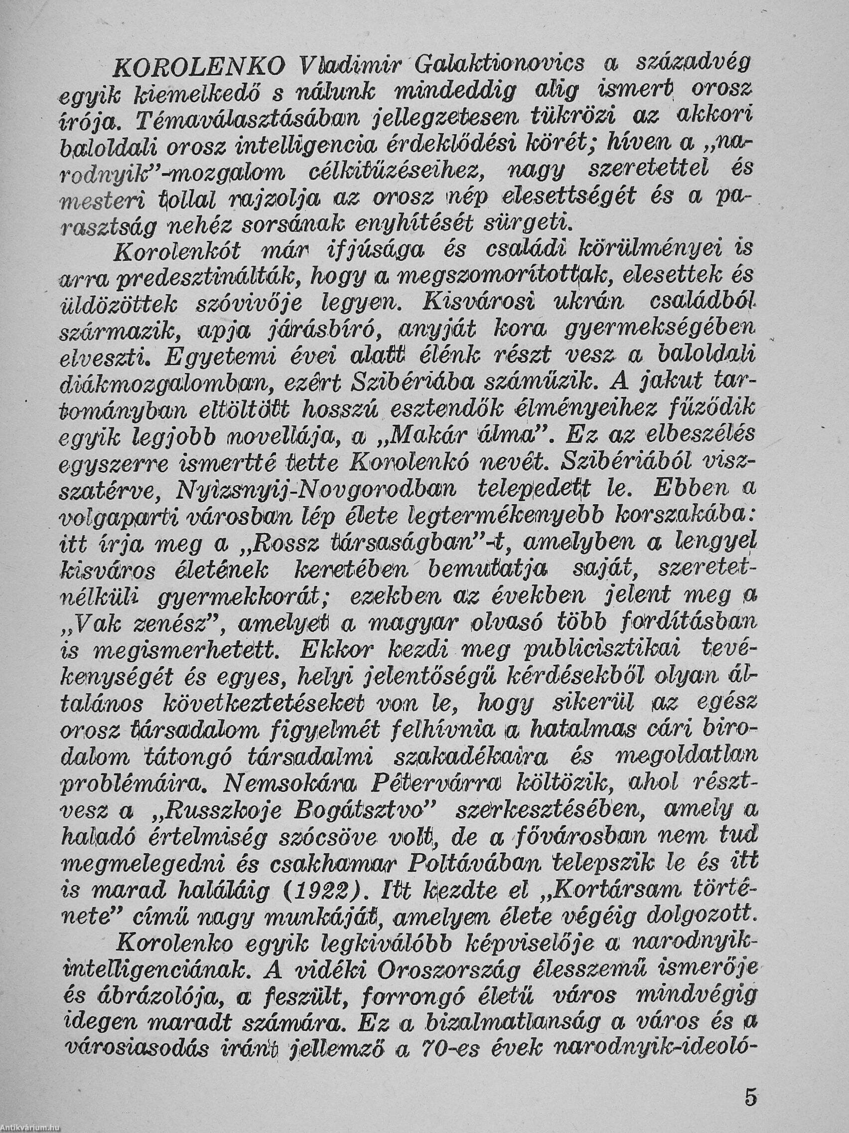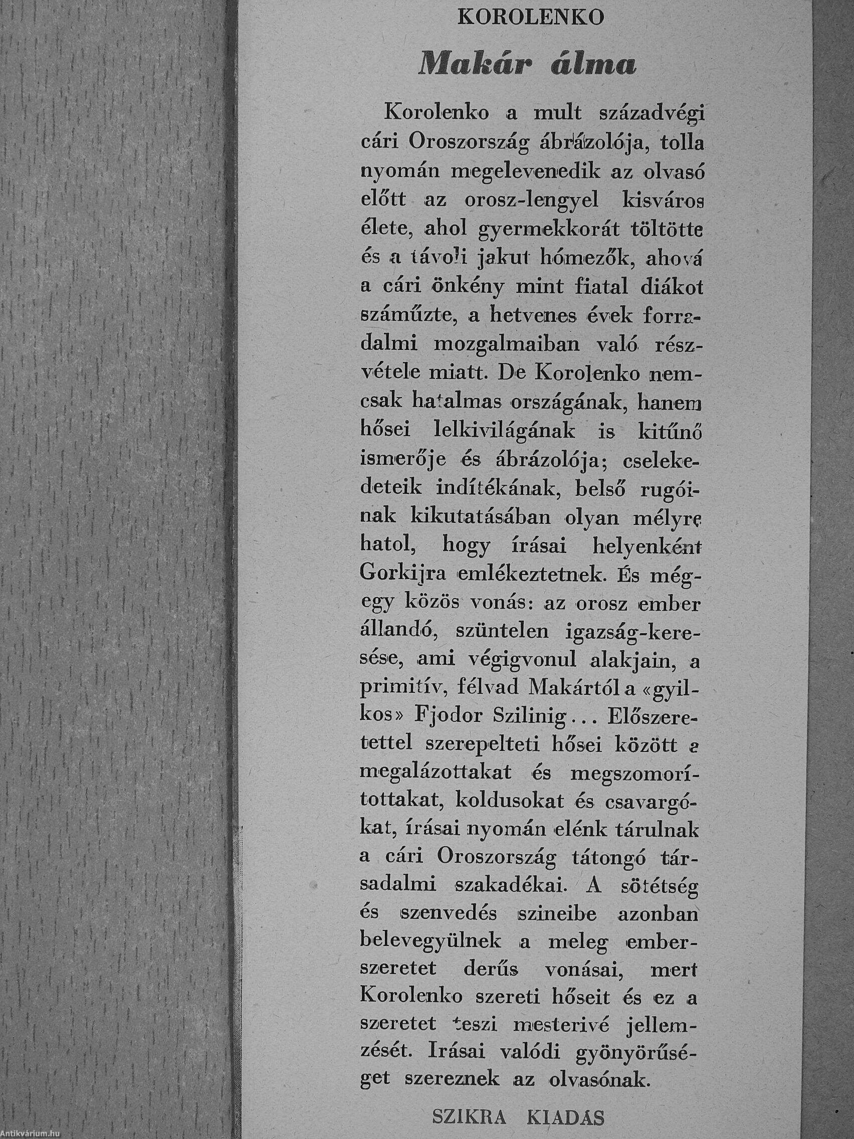 Korolenko a mult századvégi cári Oroszország ábrlázolója, tolla nyomán megelevenedik az olvasó előtt az orosz-lengyel kisváros élete, ahol gyermekkorát töltötte és a lávoK jakut hómezők, aho". á a cári önkény mint fiatal diákot száműzte, a hetvenes évek forradalmi mozgalmaiban való részvétele miatt. De Korolenko nemcsak hatalmas országának, hanem hősei lelki^dlágának is kitűnő ismerője és ábrázolója; cselekedeteik indítékának, belső rugóinak kikutat ásában olyan mélyre hatol, hogy írásai helyenként Gorkijra emlékeztetnek. És még-egy közös vonás: az orosz ember állandó, szüntelen igazság-keresése, ami végigvonul alakjain, a primitív, félvad Makártól a «gyilkos » Fjodor Szilinig Előszeretettel szerepelteti hősei között s megalázottakat és megszomorí-tottakat, koldusokat és csavargókat, írásai nyomán elénk tárulnak a cári Oroszország tátongó társadalmi szakadékai. A sötétség és szenvedés színeibe azonban belevegyülnek a meleg emberszeretet derűs vonásai, mert Korolenko szereti hőseit és ez a szeretet teszi mesterivé jellemzését. írásai valódi gyönyörűséget szereznek az olvasónak.