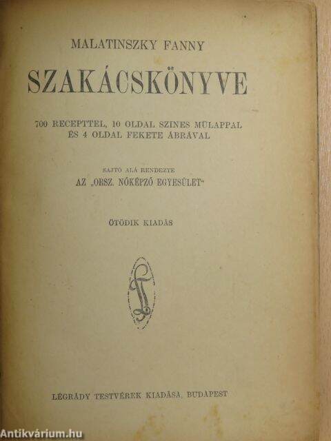 | Megjegyzés: | Ötödik kiadás. 700 recepttel, 10 oldal színes műlappal és 4 oldal fekete-fehér ábrával. Sajtó alá rendezte az "Orsz. Nőképző Egyesület". Légrády Testvérek Kő- és Könyvnyomdája nyomása, Budapest. |
