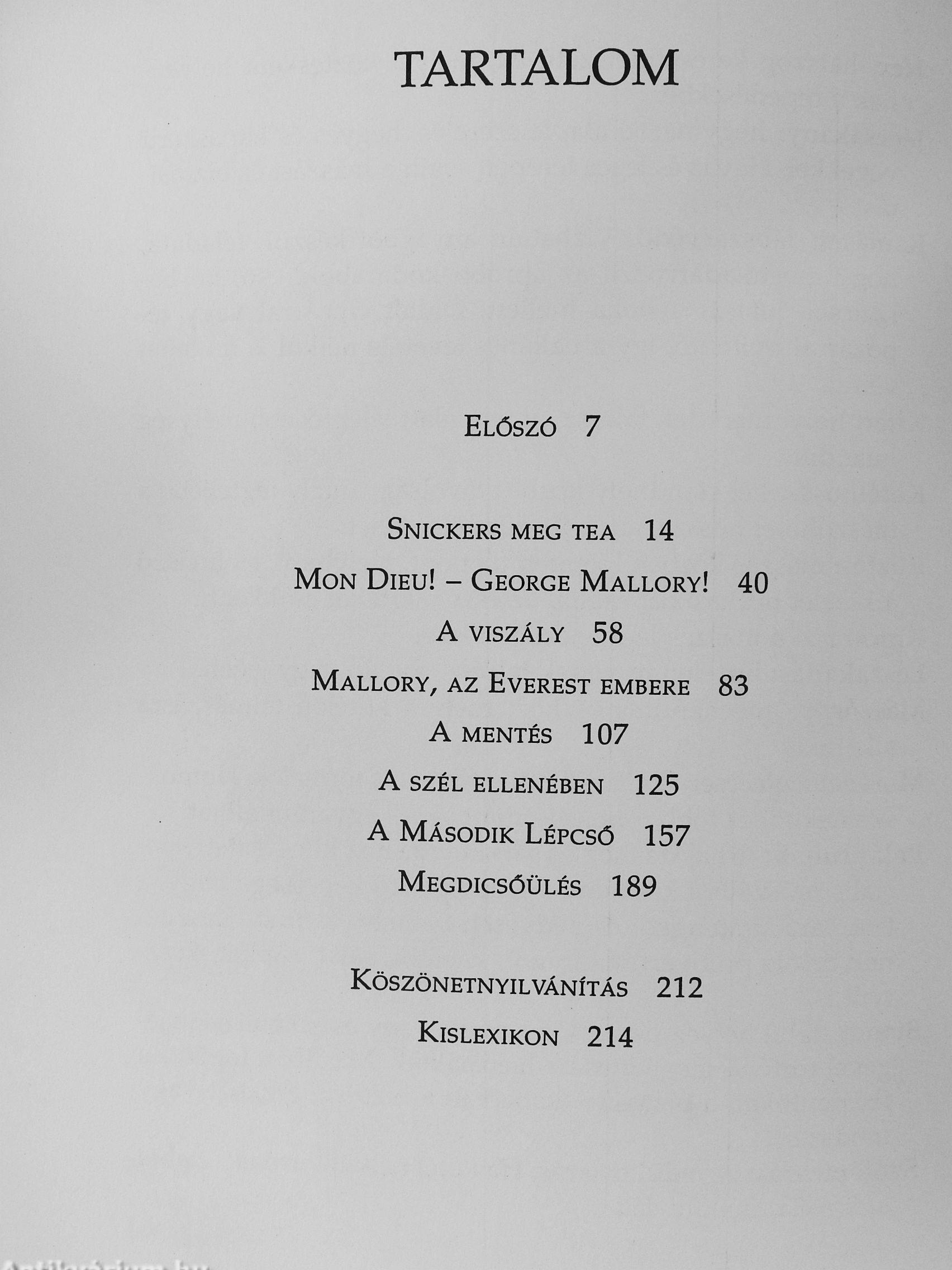 Az 1999-es év óriási szenzációja volt, amikor a Mount Everestre induló egyik kutatóexpedíció 8220 méter magasan rábukkant a hetvenöt évvel ezelőtt nyomtalanul eltűnt George Mallory holttestére, mely a gleccser jegébe fagyva elképesztően jó állapotban maradt fent. A körülötte talált személyes tárgyak (karóra, szemüveg, magasságmérő, levelek) és a holttestre rábukkanó Conrad Anker elbeszélése és feltételezései nyomán lélegzetelállító detektívregény bontakozik ki az olvasó előtt.