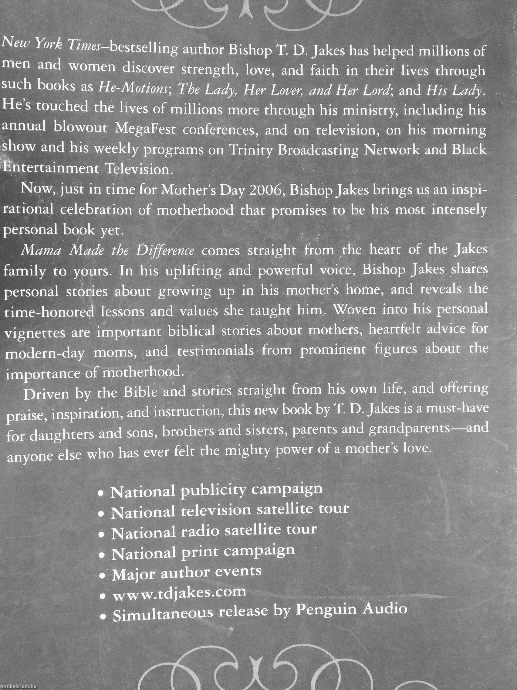 Mama Made the Difference comes straight from the heart of the Jakes family to yours. In his uplifting and powerful voice. Bishop Jakes shares personal stories about growing up in his mother's home, and reveals the time-honored lessons and values she taught him. Woven into his personal vignettes are important biblical stories about mothers, heartfelt advice for modern-day moms, and testimonials from prominent figures about the importance of motherhood.