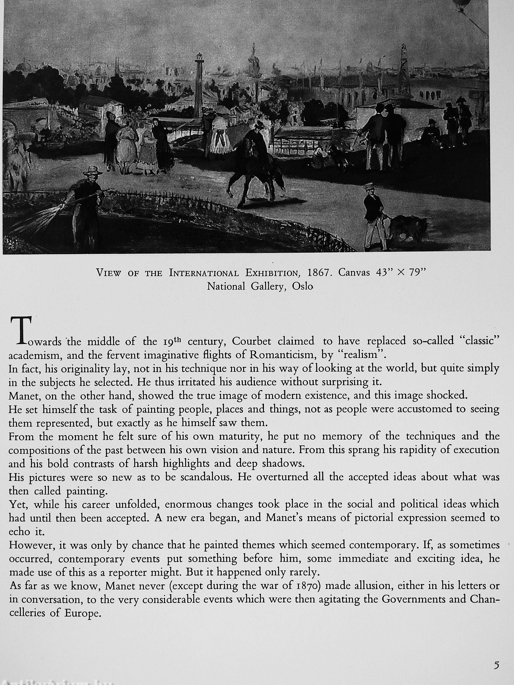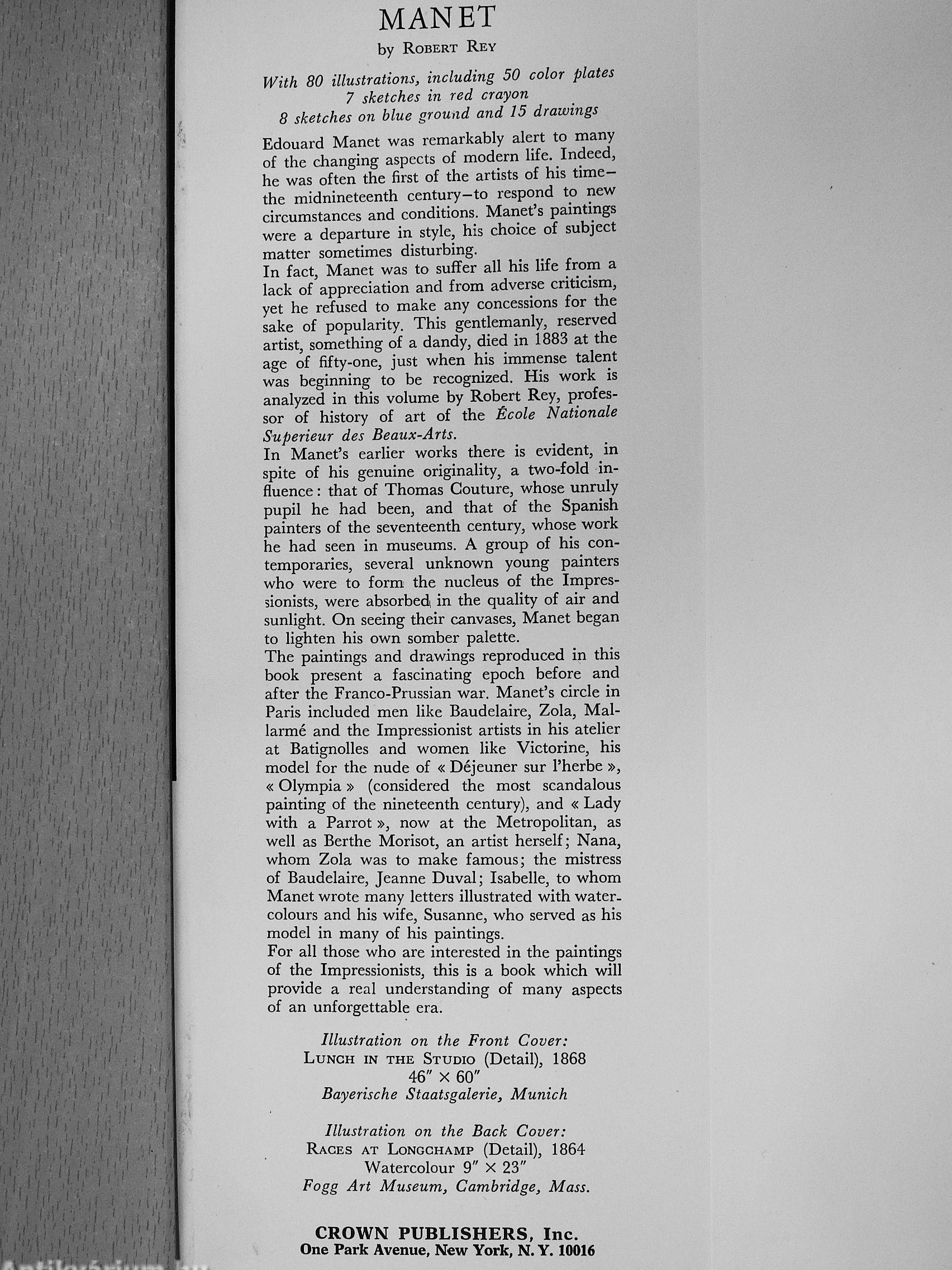 Edouard Manet was remarkably alert to many of the changing aspects of modern life. Indeed, he was often the first of the artists of his time-the midnineteenth century-to respond to new circumstances and conditions. Manet's paintings were a departure in style, his choice of subject matter sometimes disturbing. In fact, Manet was to suffer all his life from a lack of appreciation and from adverse criticism, yet he refused to make any concessions for the sake of popularity. This gentlemanly, reserved artist, something of a dandy, died in 1883 at the age of fifty-one, just when his immense talent was beginning to be recognized. His work is analyzed in this volume by Robert Rey, professor of history of art of the École Nationale Supérieur des Beaux-Arts. In Manet's earlier works there is evident, in spite of his genuine originality, a two-fold influence : that of Thomas Couture, whose unruly pupil he had been, and that of the Spanish painters of the seventeenth century, whose work he had seen in museums. A group of his contemporaries, several unknown young painters who were to form the nucleus of the Impressionists, were absorbed* in the quality of air and sunlight. On seeing their canvases, Manet began to lighten his own somber palette. The paintings and drawings reproduced in this book present a fascinating epoch before and after the Franco-Prussian war. Manet's circle in Paris included men like Baudelaire, Zola, Mallarmé and the Impressionist artists in his atelier at Batignolles and women like Victorine, his model for the nude of « Déjeuner sur l'herbe », « Olympia » (considered the most scandalous painting of the nineteenth century), and « Lady with a Parrot », now at the Metropolitan, as well as Berthe Morisot, an artist herself; Nana, whom Zola was to make famous; the mistress of Baudelaire, Jeanne Duval; Isabelle, to whom Manet wrote many letters illustrated with water, colours and his wife, Susanne, who served as his model in many of his paintings. For all those who are interested in the paintings of the Impressionists, this is a book which will provide a real understanding of many aspects of an unforgettable era.