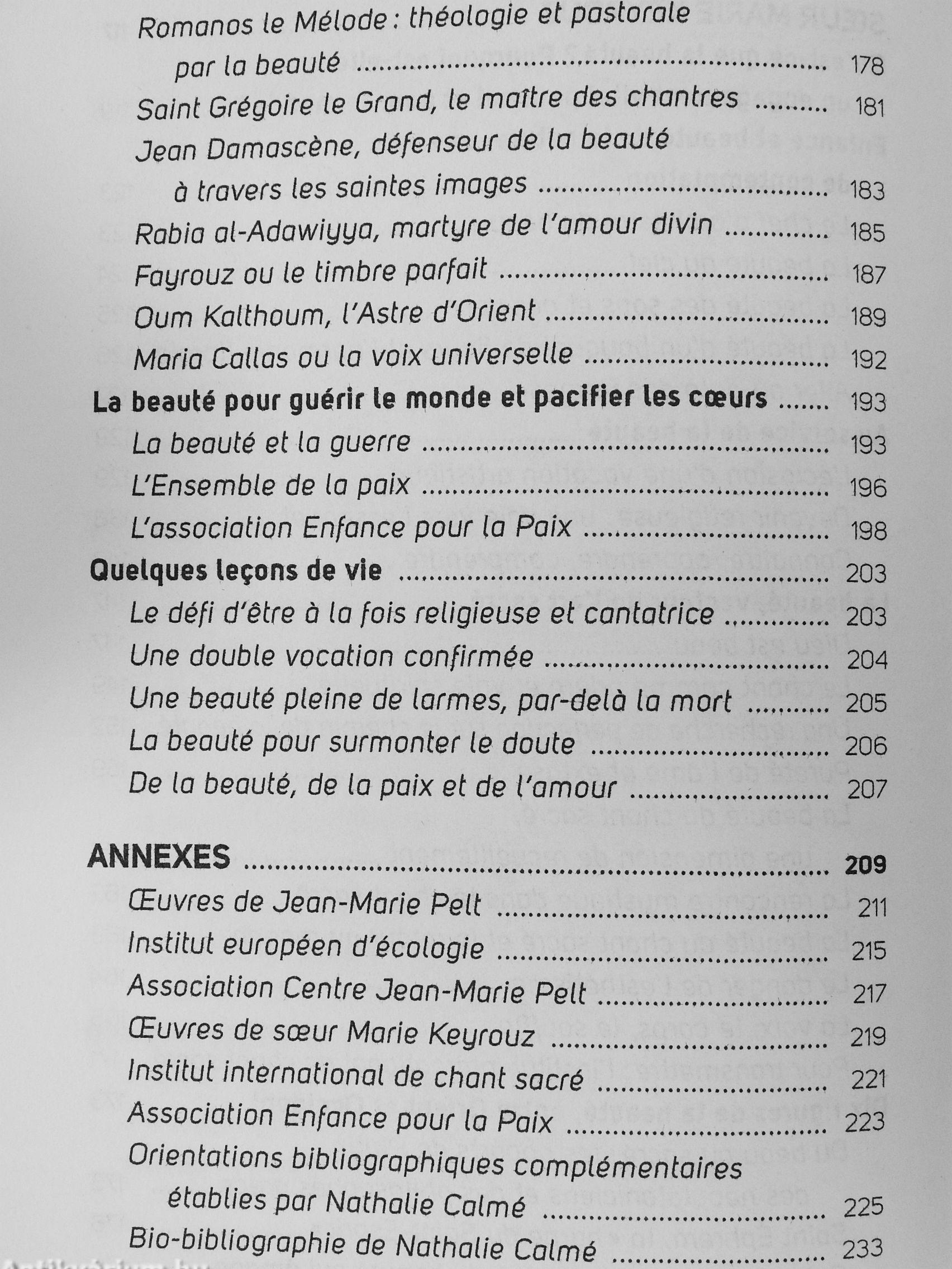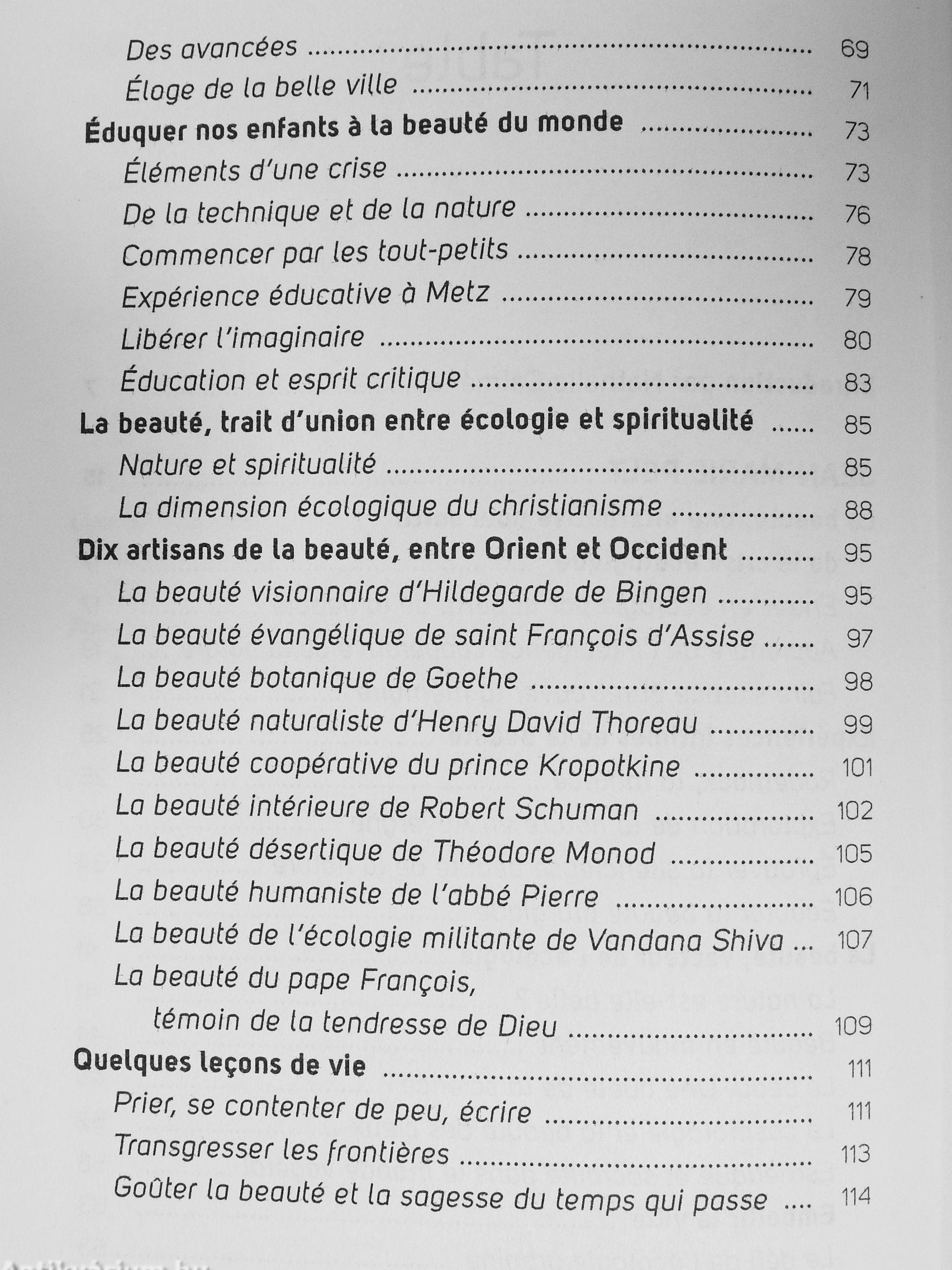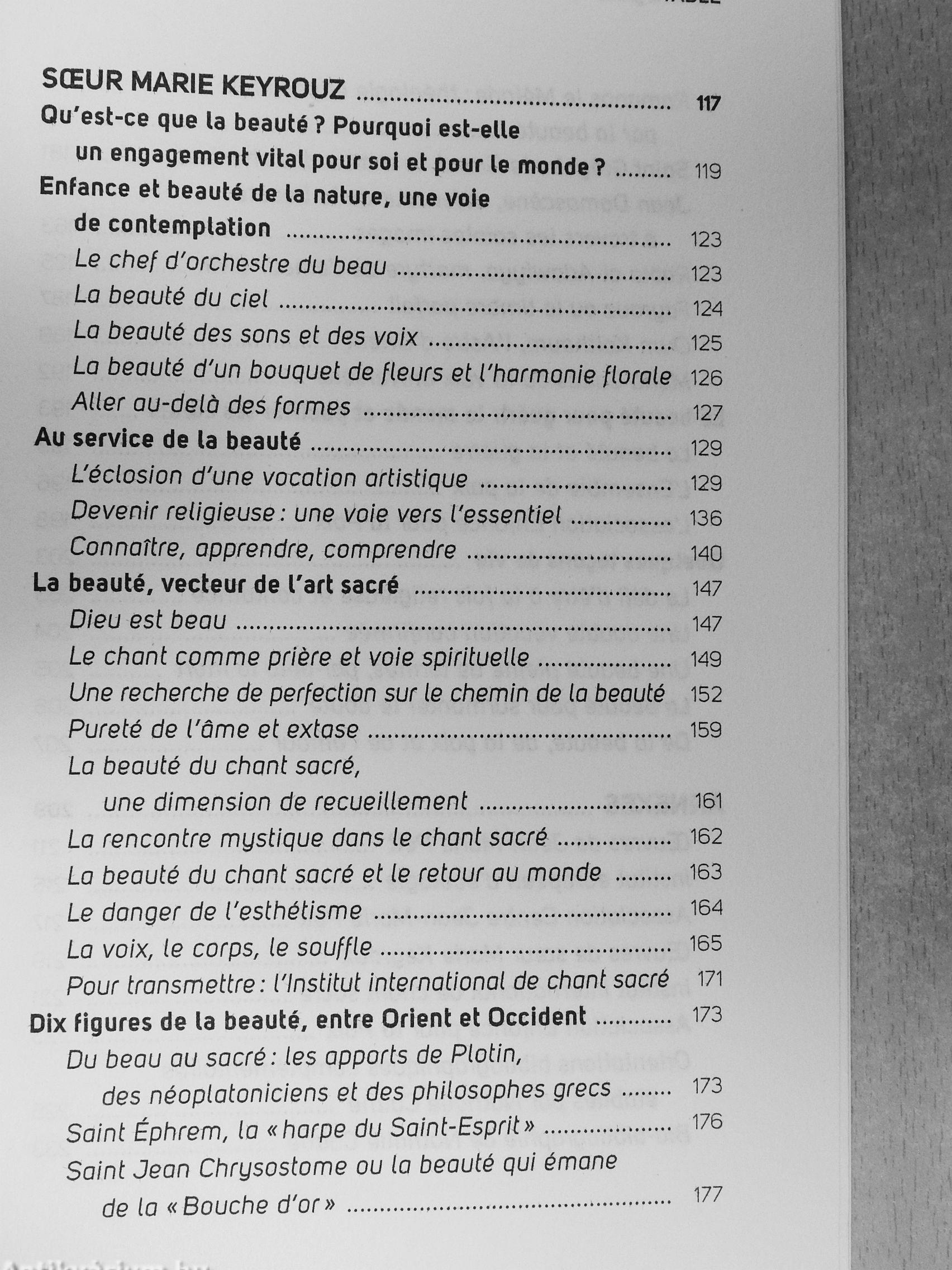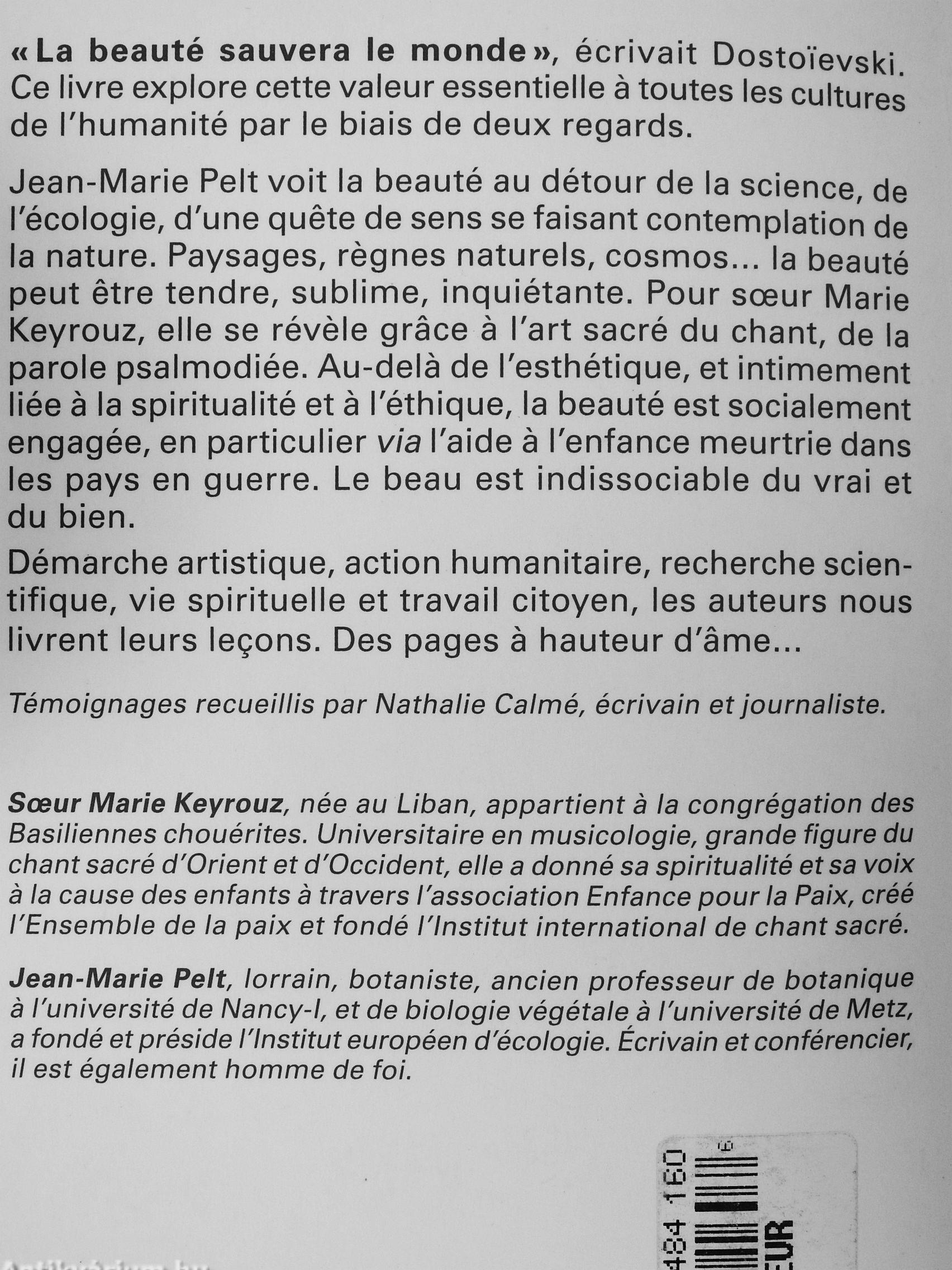 Jean-Marie Pelt voit la beauté au détour de la science, de l'écologie, d'une quete de sens se faisant contennpiation de la nature. Paysages, regnes naturels, cosnnos la beauté peut etre tendre, sublime, inquiétante. Pour sour Marie Keyrouz, elle se révele grâce a l'art sacré du chant, de la parole psalmodiée. Au-dela de l'esthétique, et intimement liée a la spiritualité et a l'éthique, la beauté est socialement engagée, en particulier via l'aide a l'enfance meurtrie dans les pays en guerre. Le beau est indissociable du vrai et du bien.