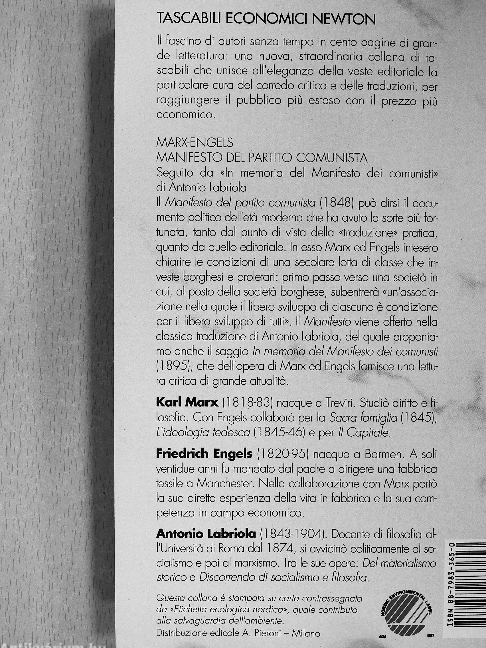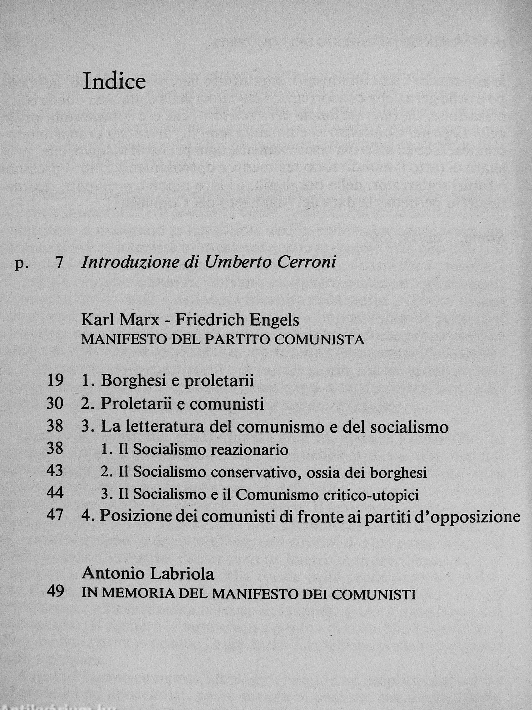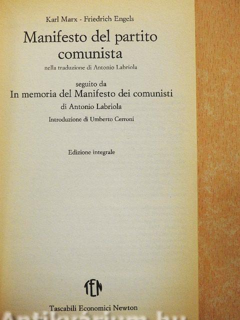 Il Manifesto del partita comunista (1 848) puô dirsi il documento politico dell'eta moderna che ho avuto la sorte piu for-tunato, tanto dal punto di visto dello «traduzione» pratico, quonto do quello éditoriale. In esso Marx ed Engels intesero chiarire le condizioni di una secolore lotto di classe che investe borghesi e proletari: primo passo verso una societa in cui, al posto dello societa borghese, subentrera «undssocia-zione nelia quale il libero sviluppo di cioscuno e condizione per il libero sviluppo di tutti». Il Manifesto viene offerto nella cbssico traduzione di Antonio Labriola, del quale proponia-mo anche il soggio In memoria del Manifesto dei comunisti ( 1 895), che dell'opera di Marx ed Engels fornisce una lettu-ro critico di grande ottuolita.