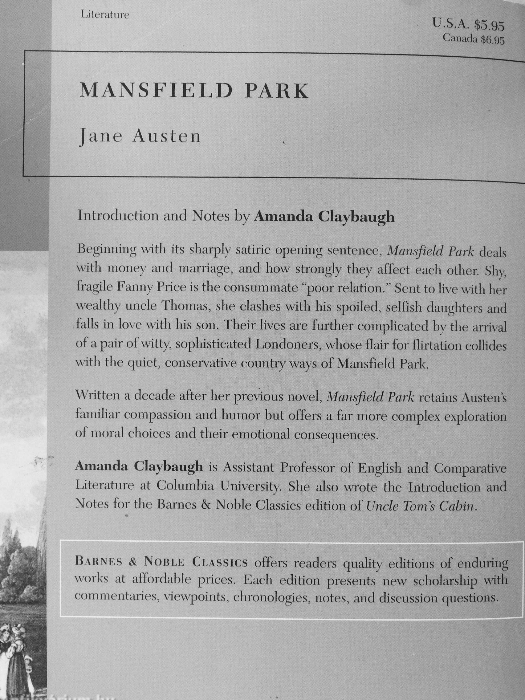 Ik^gimiing with its sharply satiric opeiiiiig sentence, Mansfield Park deals with money and marriage, and how strongly tliey affect eacli other. Sliy, (Vagile Fanny Price is the consummate 'poor relation." Sent to live with her wealthy uncle Tliomas, she clashes v\dth his spoiled, selfish daughters and falls in love with his son. Their lives are further complicated by the arrival of a pair of witty, sophisticated Londoners, wdiose flair for flirtation collides with the quiet, consen ative countiy ways of Mansfield Park.