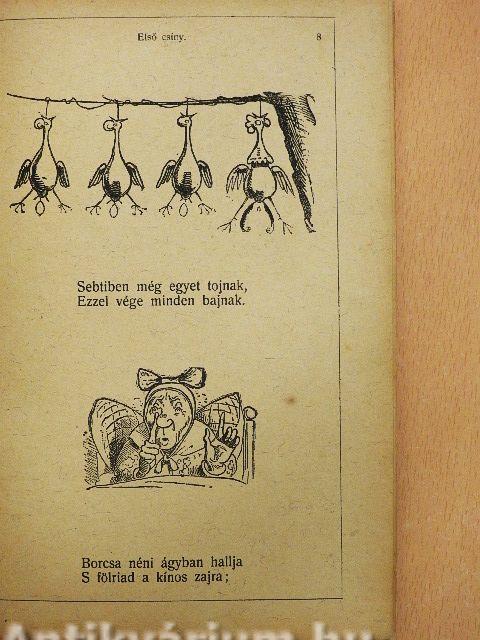 | Megjegyzés: | Kilenczvenhat fekete-fehér torzképpel, melyek a szerző rajzai. Nyomtatta Neuwald Illés Utódai Könyvnyomda, Budapest. |