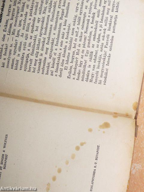 El lehetne tünődni azon sokáig, ugy-e, édes Évikém, hogyan, hol és mikor talált egymásra ez a fecskepár? Hol és mikor csicseregte az apafecske: légy az én párom! Nemcsak e nyáron, de mindörökre! Ugy gondolom, a fecskék párosodására is ráillik az emberekéről szóló mese. Hogy: van odafent, az égben, a jó Istenkének egy fanyelü bicskája, aztán sok-sok millió meg millió mogyorócskája! Fanyelü bicskával mogyorócskákat Istenke szüntelen pattogtatja kétfelé, fél mogyorócskák kavarognak a magas levegőégben, jobbra, balra, szerte-széjjel: azt hinnéd, soha, mig a világ, össze nem találkoznak - s im, hallj csudát, Évike, lent a földön összetalálkoznak az égből egyszerre indult mogyorócskák, szépen összesimulnak, ugy összesimulnak, hogy csak a halál választja el őket...