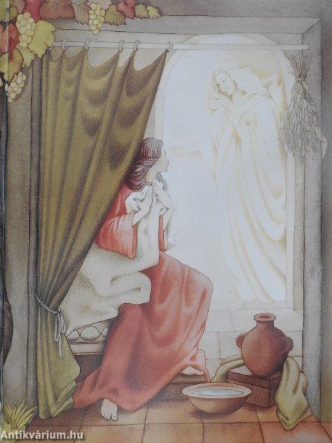Mária hallotta a hangot, de nem látott senkit. A szobácskát betöltő világosság fényesebben ragyogott a reggeli napsugárnál. Ez megijesztette, de ugyanakkor, be kellett vallania magának, hogy ilyen izgalmas hírrel nem mindennap ébreszti fel őt valaki. Ezért türelmesen várt, tekintetét a fényfolyamra függesztve. Ahogy nézte, rájött, hogy egy fénylő angyalt lát. Ő Gábriel angyal volt.