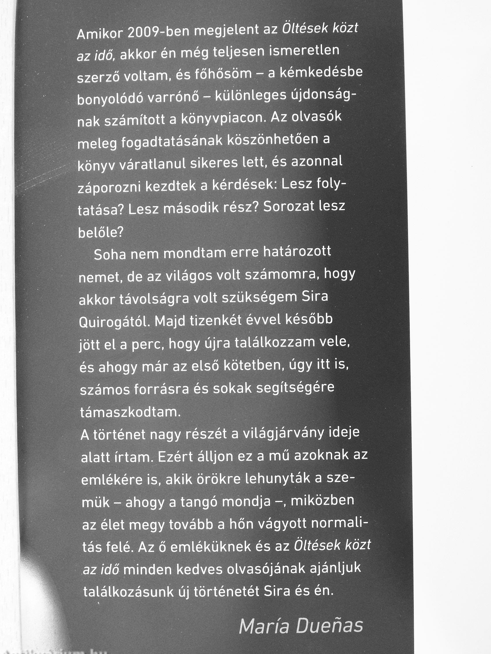 Soha nem mondtam erre határozott nemet, de az világos volt számomra, hogy akkor távolságra volt szijkségem Sira Quirogától. Majd tizenkét évvel később jött el a perc, hogy újra találkozzam vele, és ahogy már az első kötetben, úgy itt is, számos forrásra és sokak segítségére támaszkodtam.