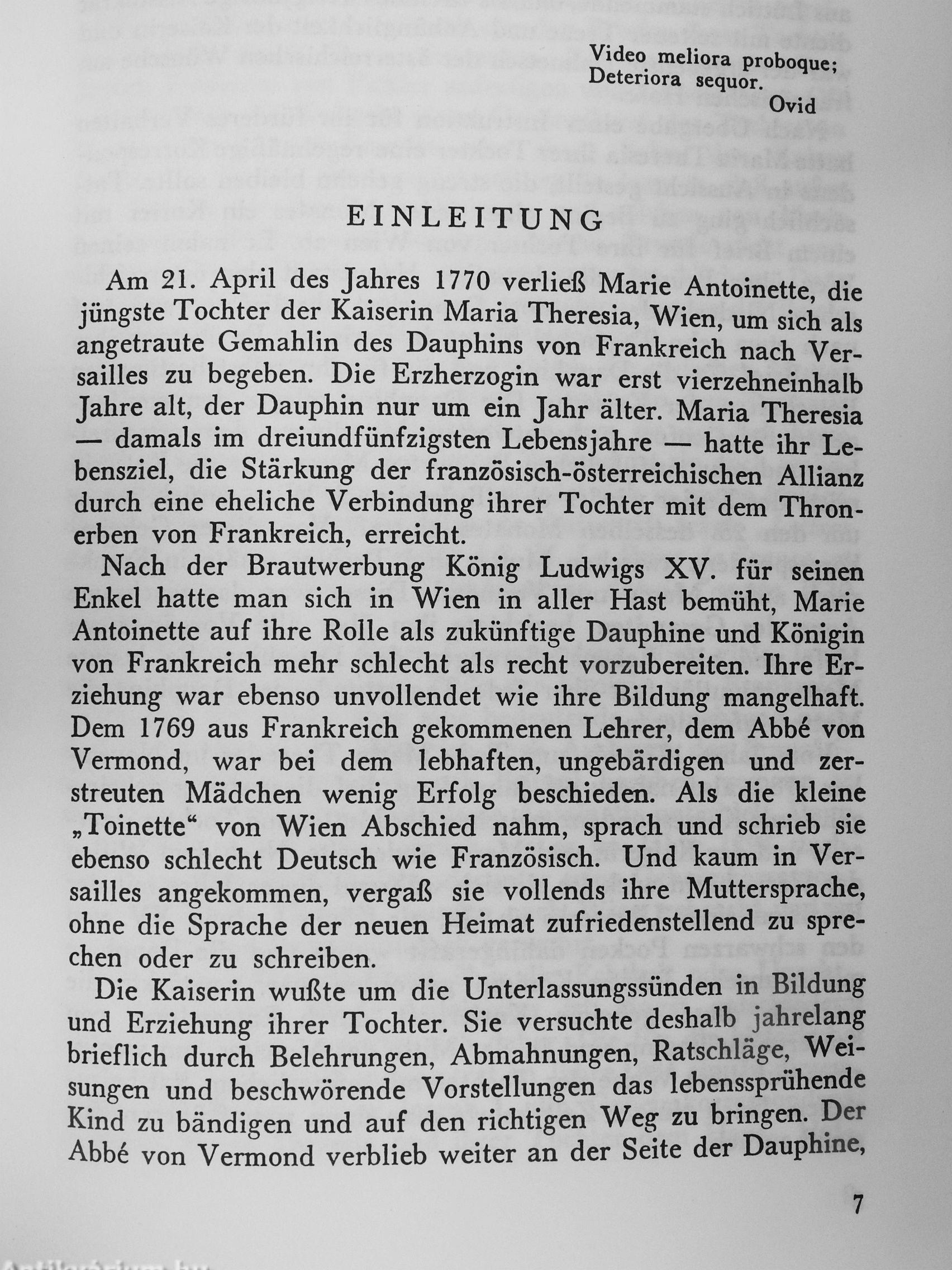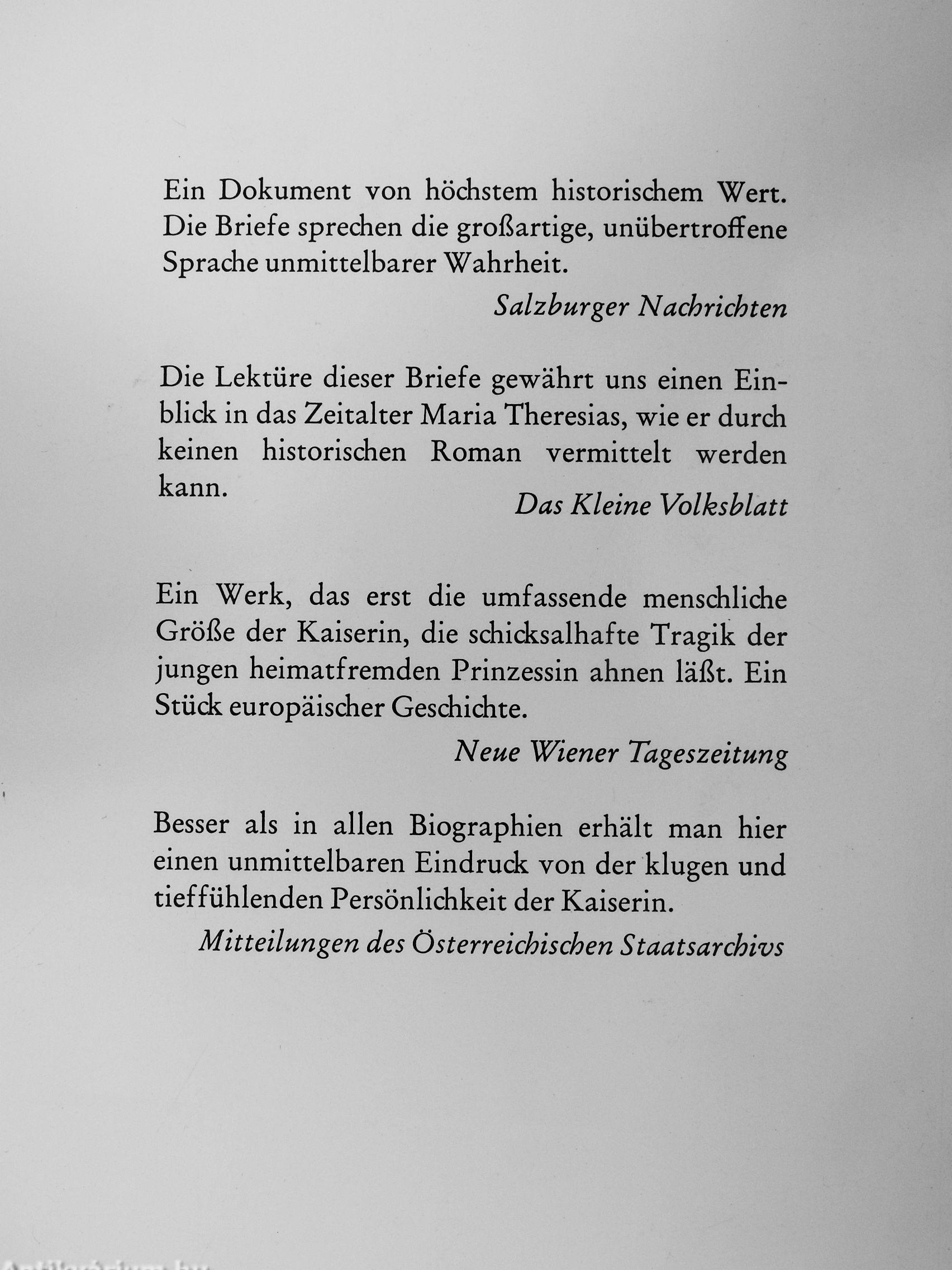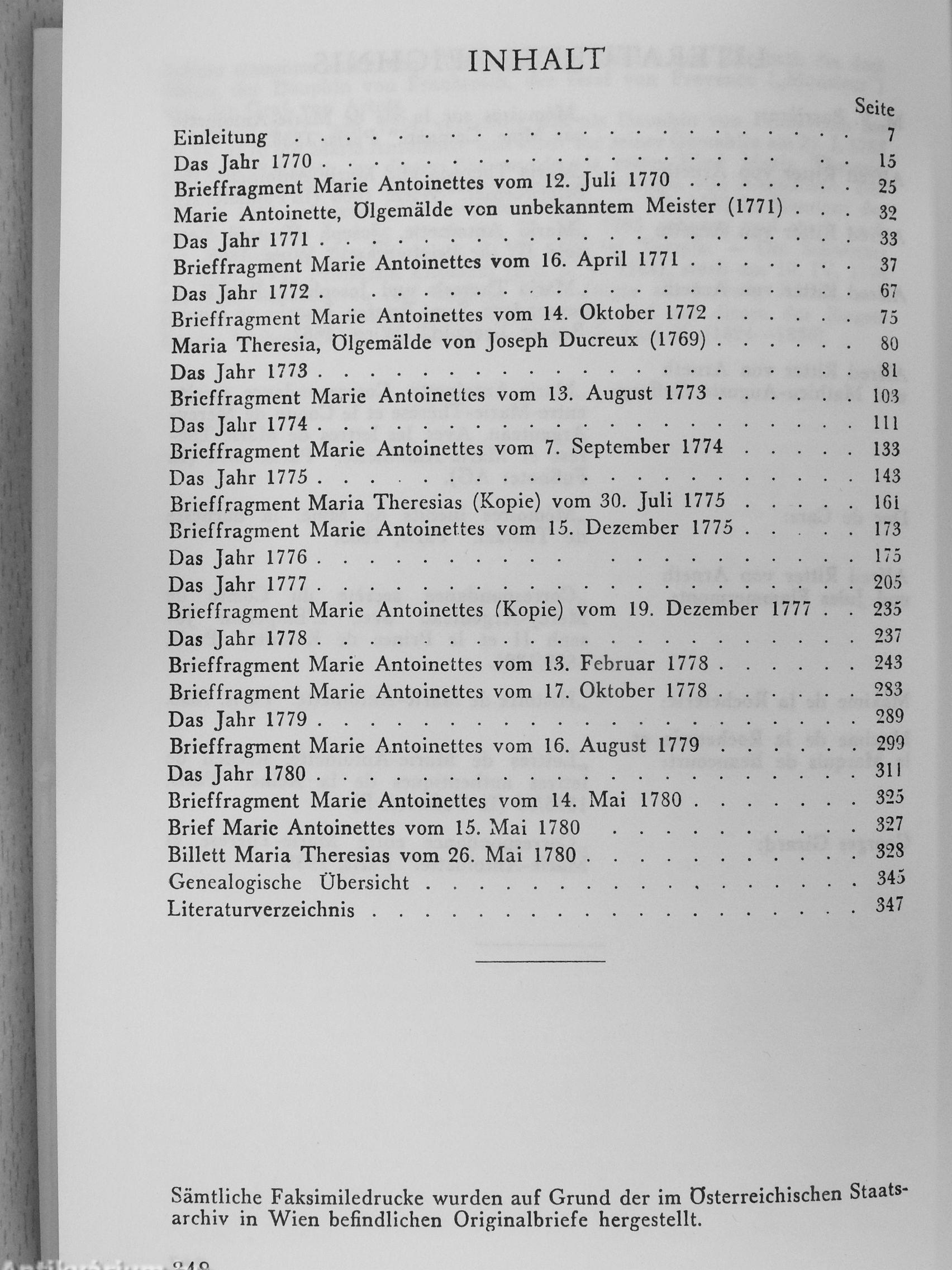 Mütterliche Sorge um das unreife Kind veranlaßte Maria Theresia, die künftige Königin Frankreichs zu regelmäßigem Briefwechsel zu verpflichten, der sie über alle Einzelheiten im weiteren Leben ihrer Toditer unterrichten sollte. So entstand in dem über zehn Jahre währenden Briefwechsel ein Dokument von großer Aussagekraft, die keine Biographie glaubhafter geben könnte.
