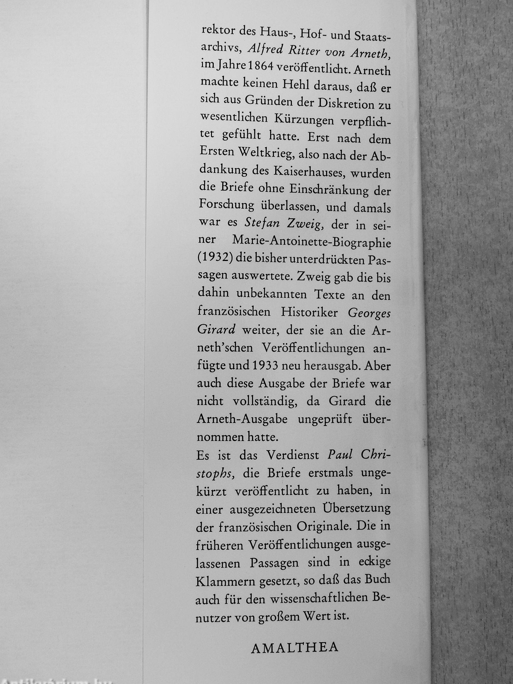 rektor des Haus-, Hof- und Staatsarchivs, Alfred Ritter von Arneth, im Jahre 1864 veröffentlicht. Arneth machte keinen Hehl daraus, daß er sich aus Gründen der Diskretion zu wesentlichen Kürzungen verpflichtet gefühlt hatte. Erst nach dem Ersten Weltkrieg, also nach der Abdankung des Kaiserhauses, wurden die Briefe ohne Einschränkung der Forschung überlassen, und damals war es Stefan Zweig, der in seiner Marie-Antoinette-Biographie (1932) die bisher unterdrückten Passagen auswertete. Zweig gab die bis dahin unbekannten Texte an den französischen Historiker Georges Girard weiter, der sie an die Ar-neth'schen Veröffentlichungen anfügte und 1933 neu herausgab. Aber auch diese Ausgabe der Briefe war nicht vollständig, da Girard die Arneth-Ausgabe ungeprüft übernommen hatte.