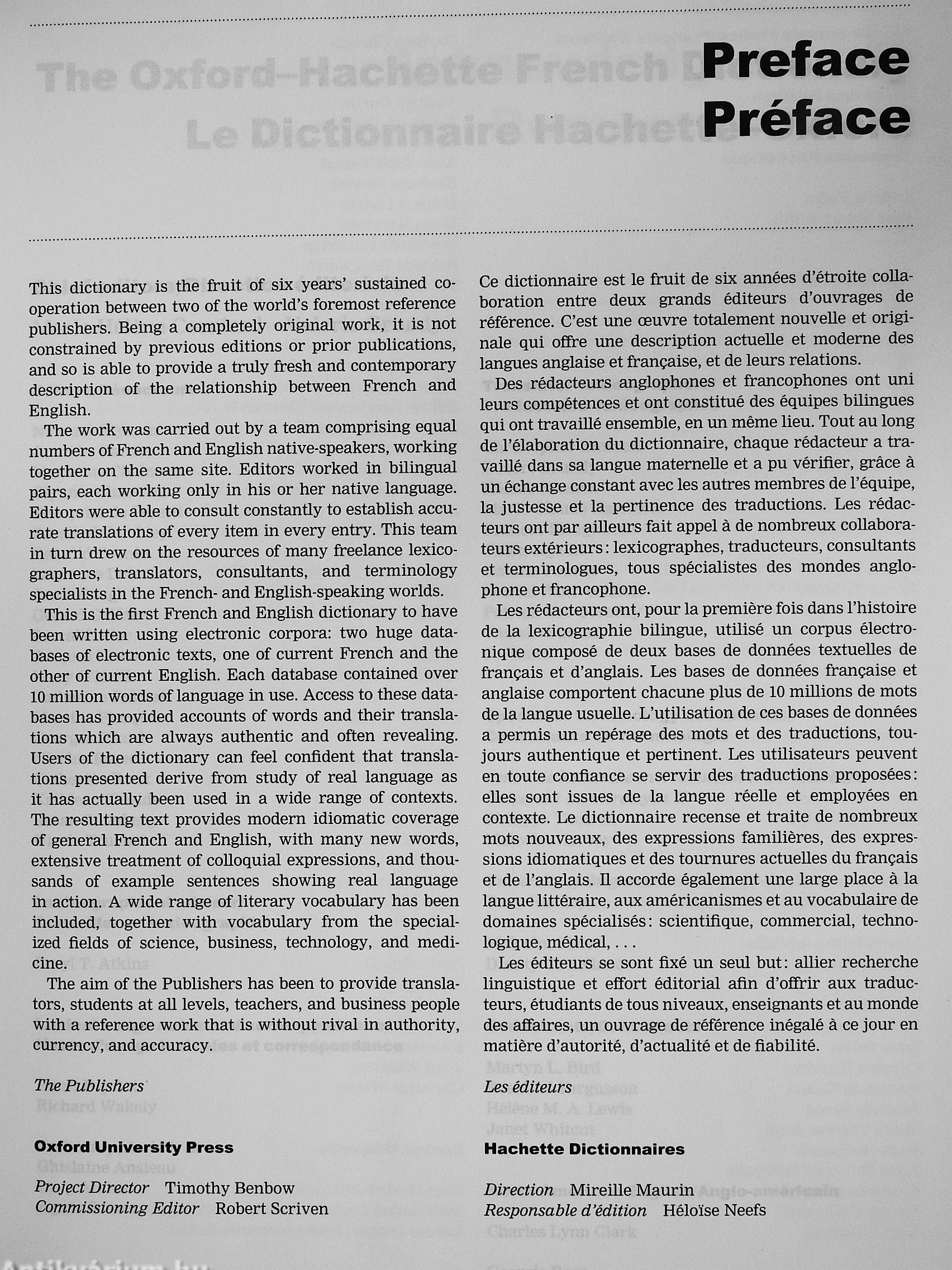 The use of corpus material is the most important innovation of the Oxford-Hachette French Dictionary, distinguishing it from all other bilingual dictionaries available today.