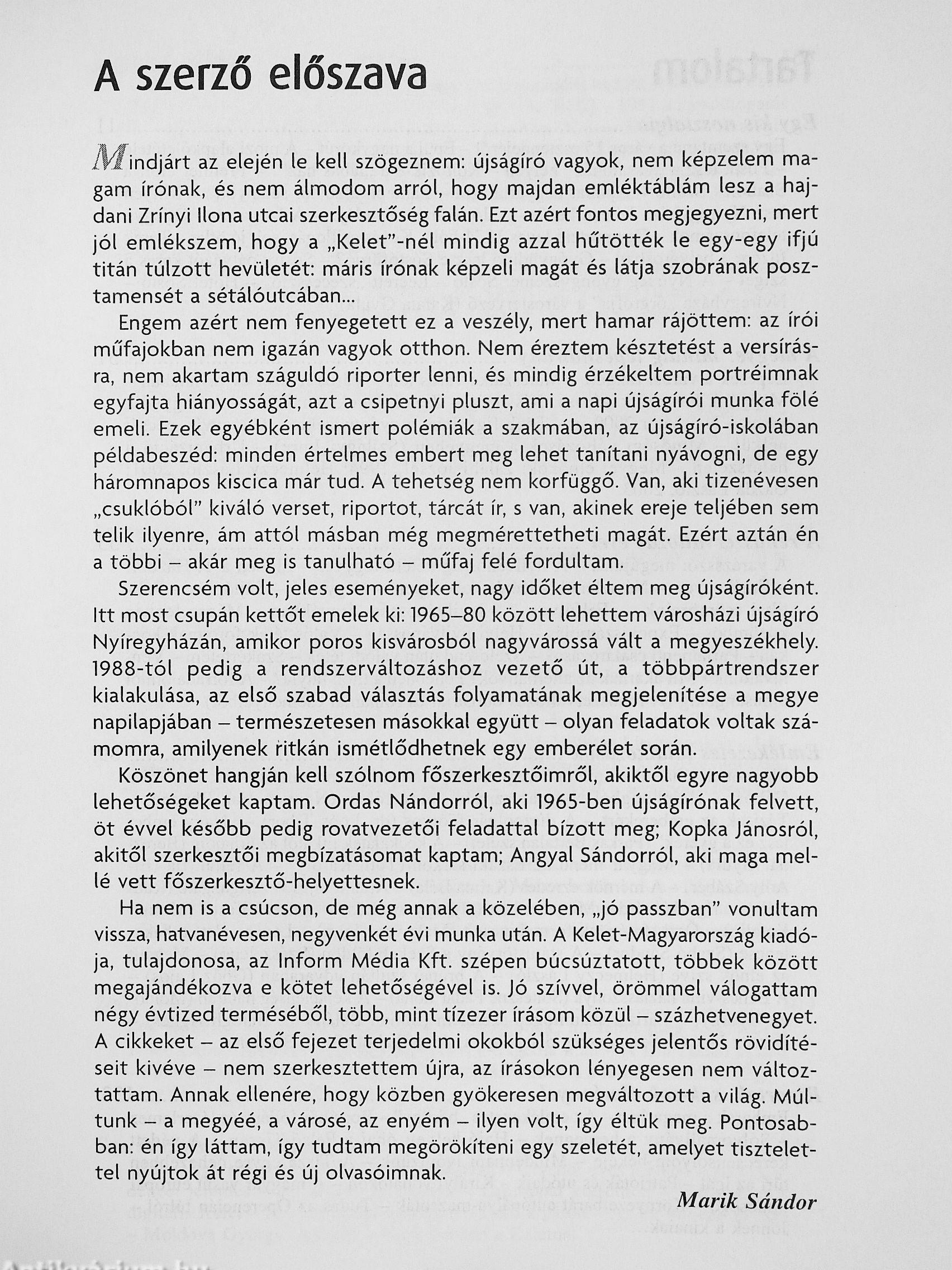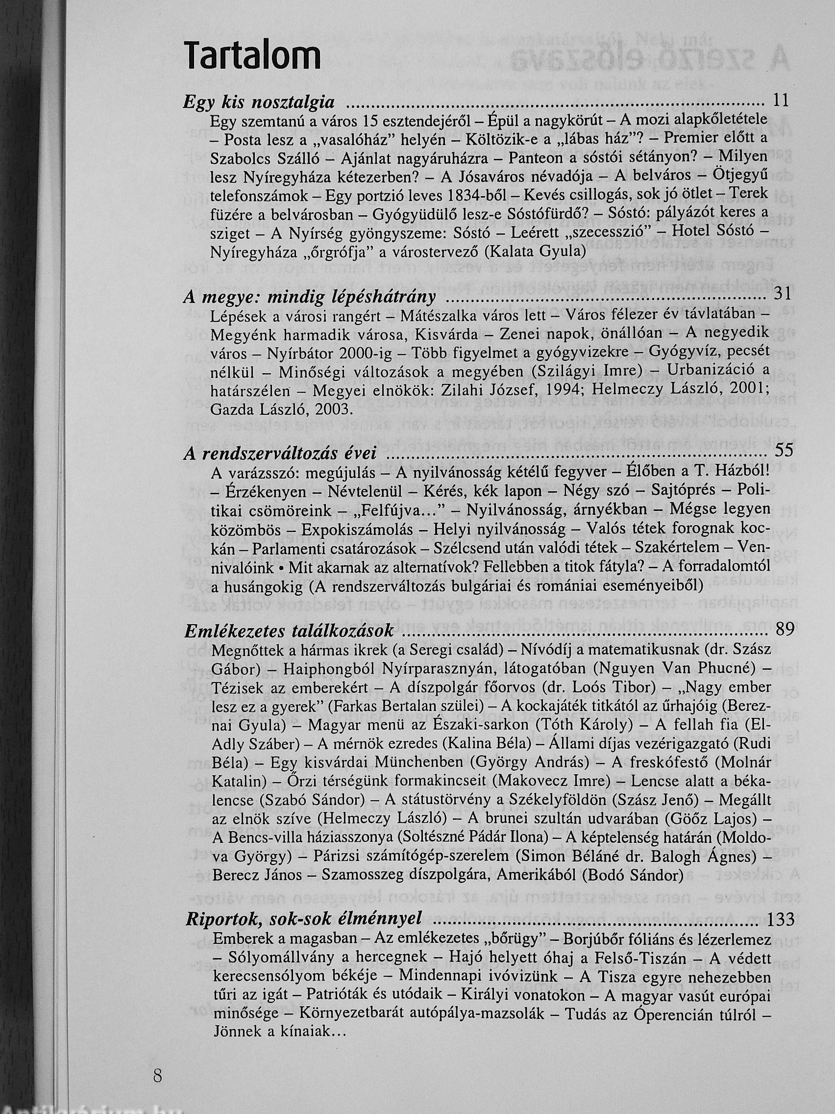Tetszett nekem a munka, mert folytatása volt a várossal történt gyermekkori ismerkedéseimnek, ma is szívesen nosztalgiázom ezekről az időkről. Édesapám 1952-ben jött dolgozni Nyíregyházára, akkor én nyolcéves voltam. A Síp utcán laktunk a belvárosban, biciklin bejártam minden utcát az alvégesi résztől a Sóstóig. „Beköltözőként" kötelességemnek tartottam, hogy a lehető legjobban megismerjem a várost. Ma már elképzelhetetlen, de évekig tyúkokat, sőt disznókat is tartottunk a belvárosban, ősszel néha kihajtottam a jószágokat makkoltatni az erdőbe. ,Jóvízért" kannával, „vedérrel" a Kossuth utca elején lévő „Sírkő-udvarba" jártunk, ott egy pumpás,...