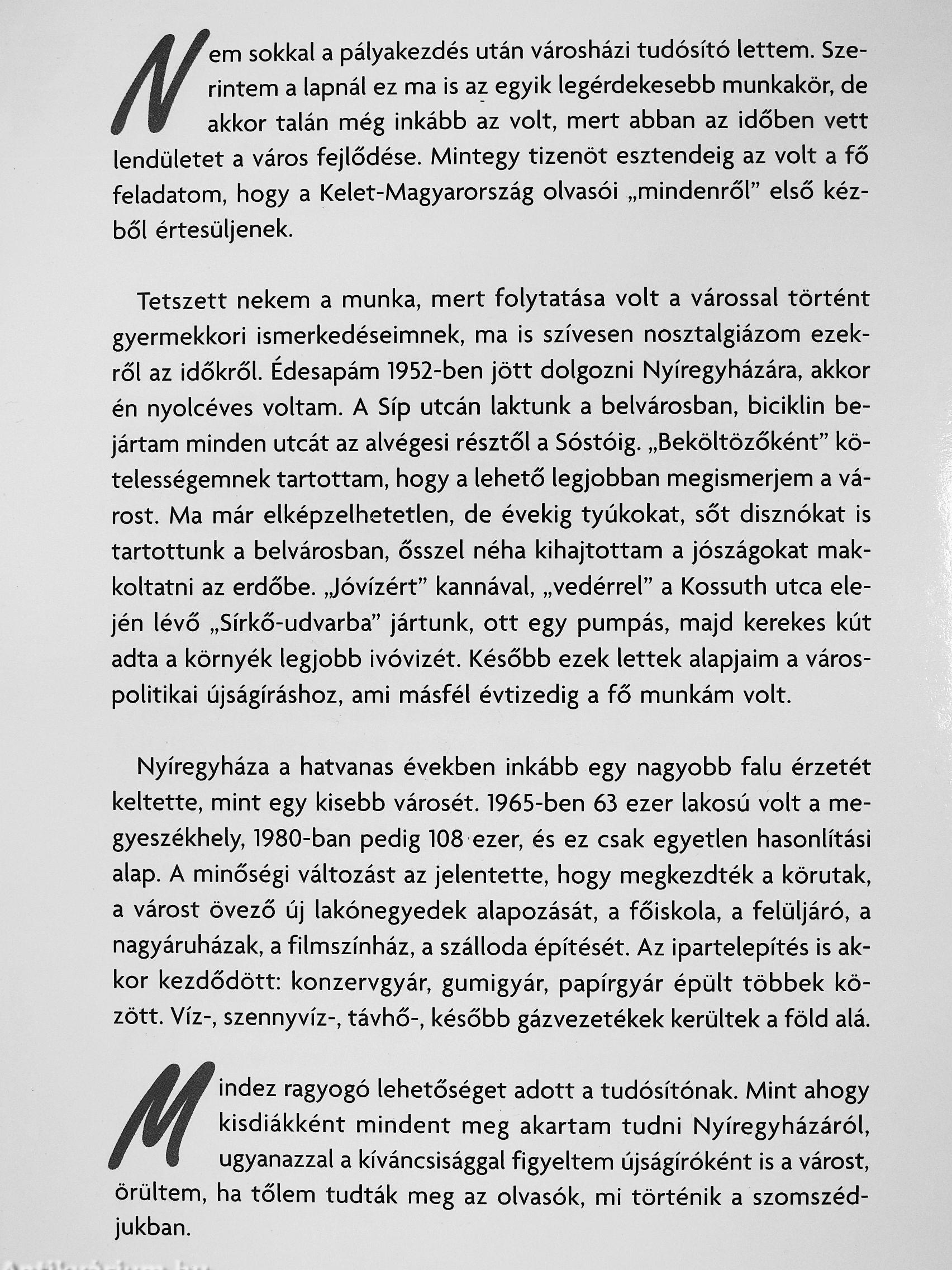 Tetszett nekem a munka, mert folytatása volt a várossal történt gyermekkori ismerkedéseimnek, ma is szívesen nosztalgiázom ezekről az időkről. Édesapám 1952-ben jött dolgozni Nyíregyházára, akkor én nyolcéves voltam. A Síp utcán laktunk a belvárosban, biciklin bejártam minden utcát az alvégesi résztől a Sóstóig. „Beköltözőként" kötelességemnek tartottam, hogy a lehető legjobban megismerjem a várost. Ma már elképzelhetetlen, de évekig tyúkokat, sőt disznókat is tartottunk a belvárosban, ősszel néha kihajtottam a jószágokat makkoltatni az erdőbe. ,Jóvízért" kannával, „vedérrel" a Kossuth utca elején lévő „Sírkő-udvarba" jártunk, ott egy pumpás, majd kerekes kút adta a környék legjobb ivóvizét. Később ezek lettek alapjaim a várospolitikai újságíráshoz, ami másfél évtizedig a fő munkám volt.