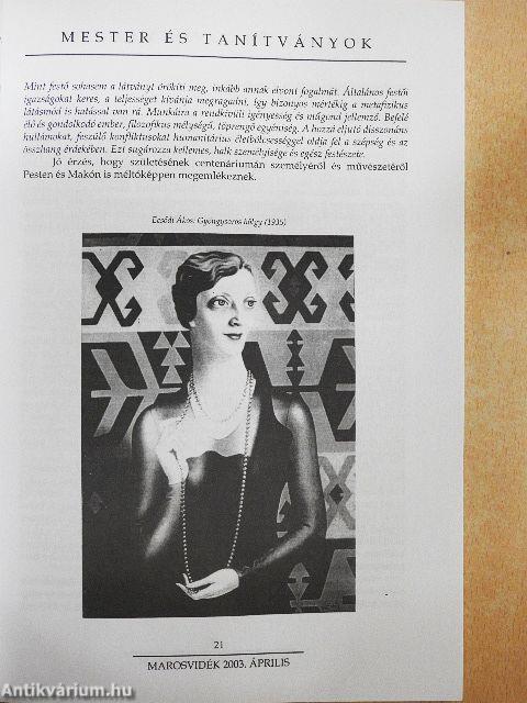 Folyóiratunk, az immár negyedik évfolyamába lepő Marosvidék jelenlegi számában egykori tanítványok emlékeznek vissza egy száz esztendeje született festőre, Ecsődi Ákosra, aki férfikora meghatározó másfél évtizedét töltötte Makón. Ez a halkszavú, visszahúzódó művész a maga szelíd módján mérce volt a Maros parti Konstantinápoly lakói számára. Szellemi és művészi rangját a helyi művészek, kollegái, tanítványai és a város közönsége egyaránt elismerte és bár az az elvontabb, filozofikus világszemlélet, amelyet a gimnázium ma már legendává vált Ecsődi- Hetvényi-Kertész hármasa képviselt; kissé távoli volt a többség számára, szerették és tisztelték.