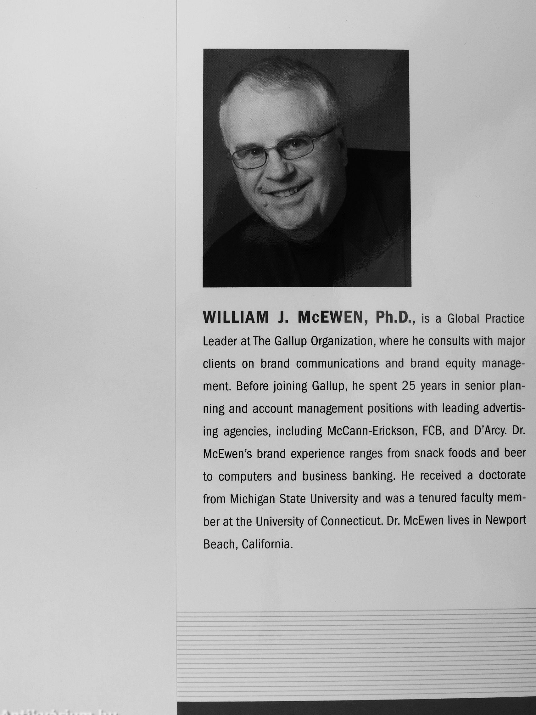 WILLIAM J. MCEWEN, Ph.D., is a Global Practice Leader at The Gallup Organization, where he consults with nfiajor clients on brand communications and brand equity management. Before joining Gallup, he spent 25 years in senior planning and account management positions with leading advertising agencies, including McCann-Erickson, FCB, and D'Arcy. Dr. McEwen's brand experience ranges from snack foods and beer to computers and business banking. He received a doctorate from Michigan State University and was a tenured faculty member at the University of Connecticut. Dr. McEwen lives in Newport Beach, California.