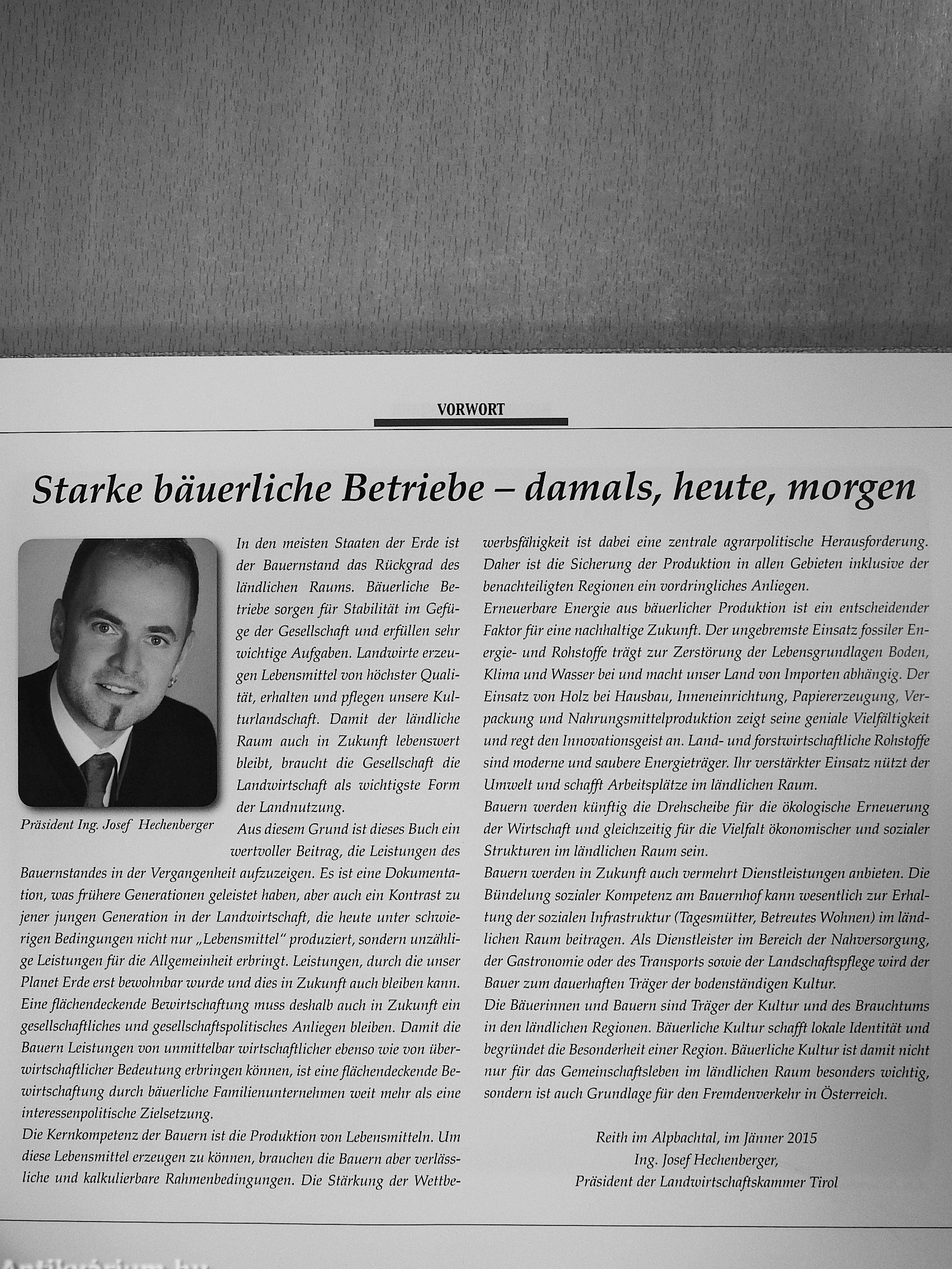 Dieses Buch ist ein wertvoller, Beitrag, die Leistungen des Bauernstandes in der Vergangenheit aiifzüzeige.n.-Es ist eine DokuTnehta- • tion, was-frühere. Generationen geleistet haben, aber auch ein Kontrast zu jener-jungen Generation in dei' LattdwirtS:chaß, die heilte -unter schwierigen Bedingungen nicht nur „Lebensmittel" produziert, sondern unzählige Léistuúgéríßir die Allgemeinheit erbringt Eineßächendeckende B'ewirtschcißung muss deshalb auch in Zukimß ein gesellschaßliche's und gesellschaßspoUtisches-Anliegen bleiben. Der qualitative Beitrag, den die Bauern zum Gemeinwohl leisten, überragt ihren zahlenmäßigen Anteil an der. Gesamtbe- ' völkerung. Die Land-, und Forstwirtschaß ist der Motor für die Wirtschaß im ländlichen Raum.'Sie ist Lieferant und Außraggeber für und Von Industrie, Gewerbe und Dienstleistungsunternehmen. Die Land- und Forstzvirtschaß schafß Lebensinittel, Rohstoffe für Gewerbe urid Industrie,- Lebensqualität und intakten Lebensraum. Bäuerliche Arbeit ist somit nach zme.vor' täglich gelebte ' Schöpßmgsverantwortung. ¦ - -. .