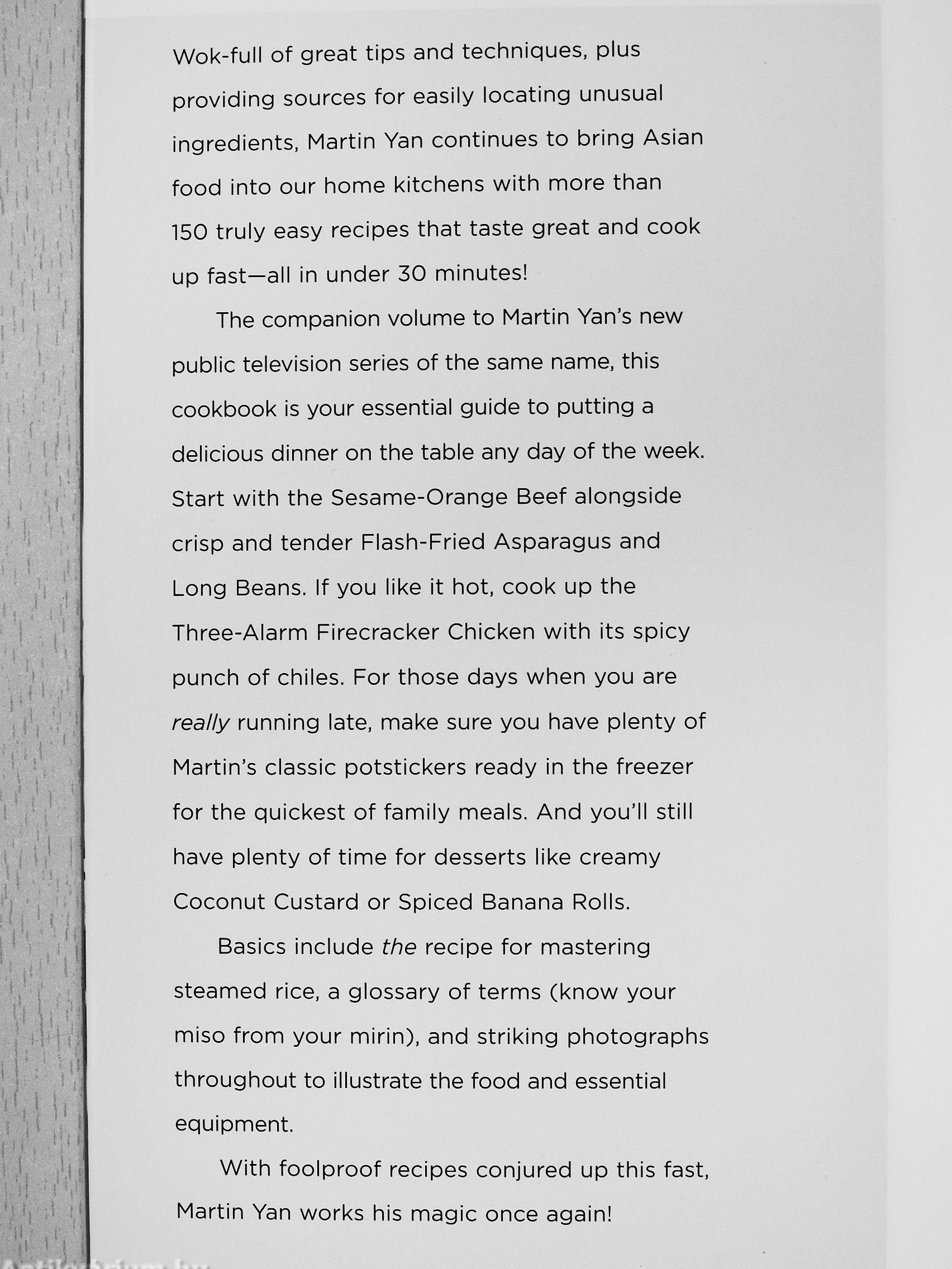 Wok-full of great tips and techniques, plus providing sources for easily locating unusual ingredients, Martin Yan continues to bring Asian food into our home kitchens with more than 150 truly easy recipes that taste great and cook up fast—all in under 30 minutes!