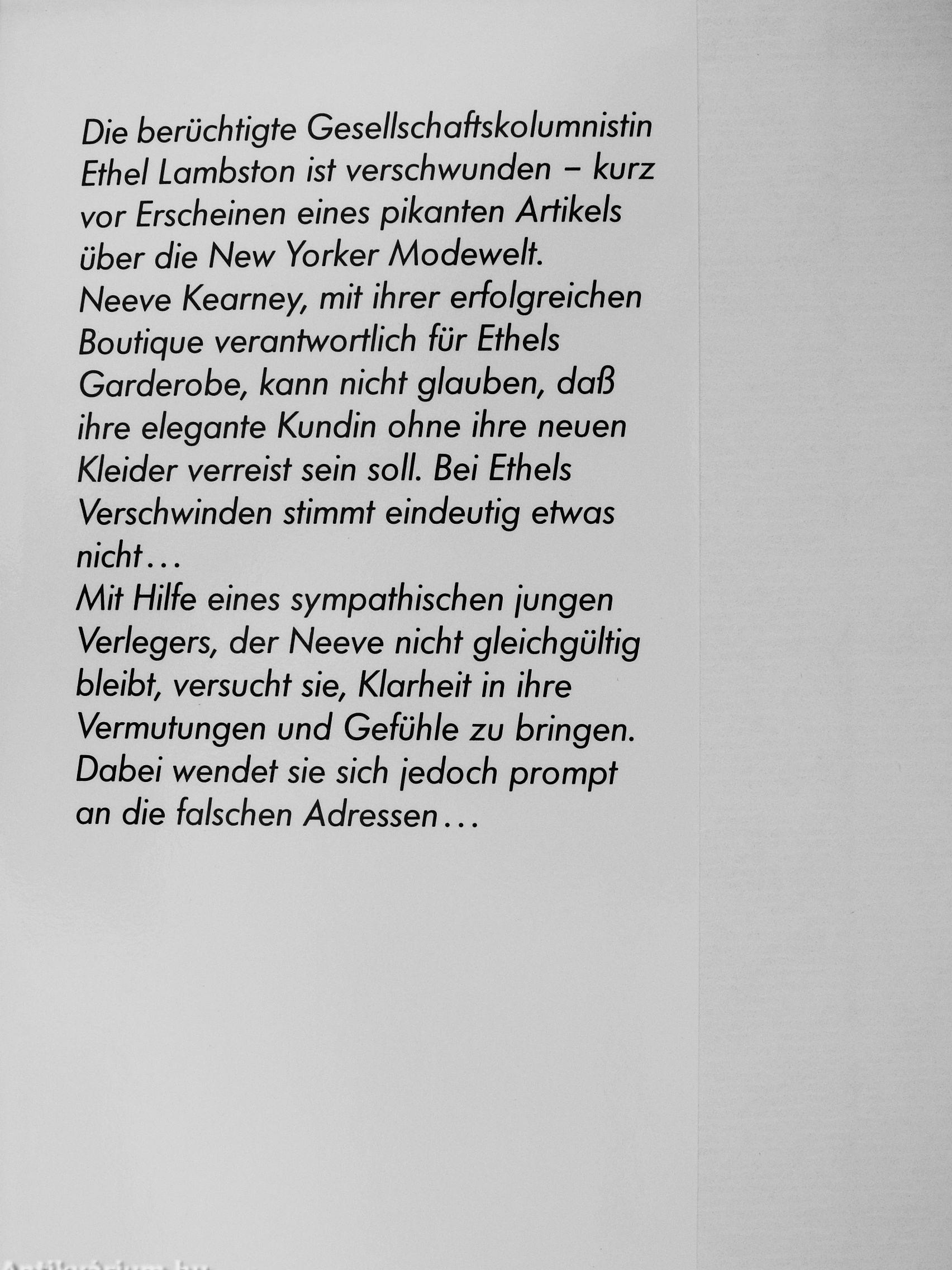 Die berüchtigte Gesellschaftskolumriistin Ethel Lambston ist verschwunden - kurz vor Erscheinen eines pikanten Artikels über die New Yorker Modewelt. Neeve Kearney, mit ihrer erfolgreichen Boutique verantwortlich für Ethels Garderobe, kann nicht glauben, daß ihre elegante Kundin ohne ihre neuen Kleider verreist sein soll. Bei Ethels Verschwinden stimmt eindeutig etwas nicht